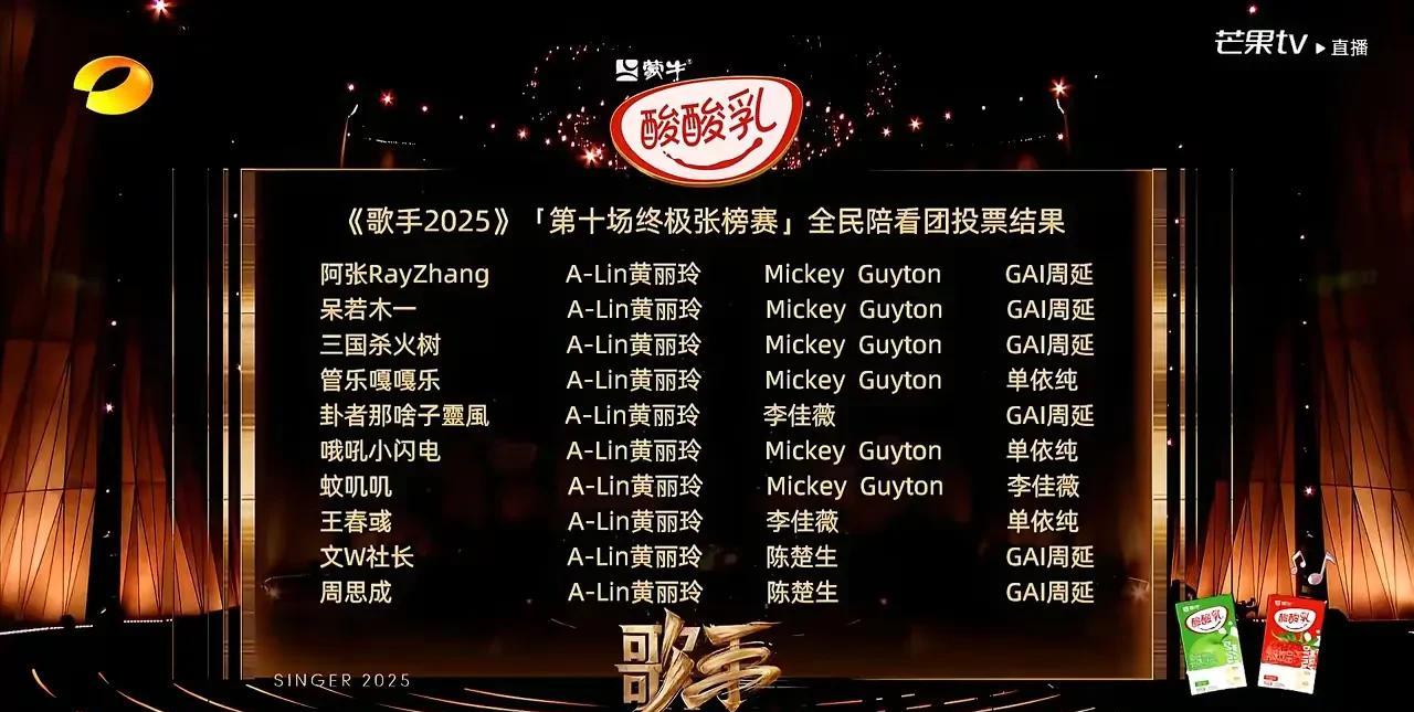 十年后再登《歌手》舞台的黄丽玲拿到本期冠军,也弥补了之前参加《我是歌手》时最好成绩仅是第二名的遗憾,“全民陪看团”的10位听审竟然全部给她投了第一名,而其中6人给GAI投了第三,看来,这两伙不在现场的观众——“云端听审”和“全民陪看团”,总是和现场的500位“大众听审”观点存在巨大差异。