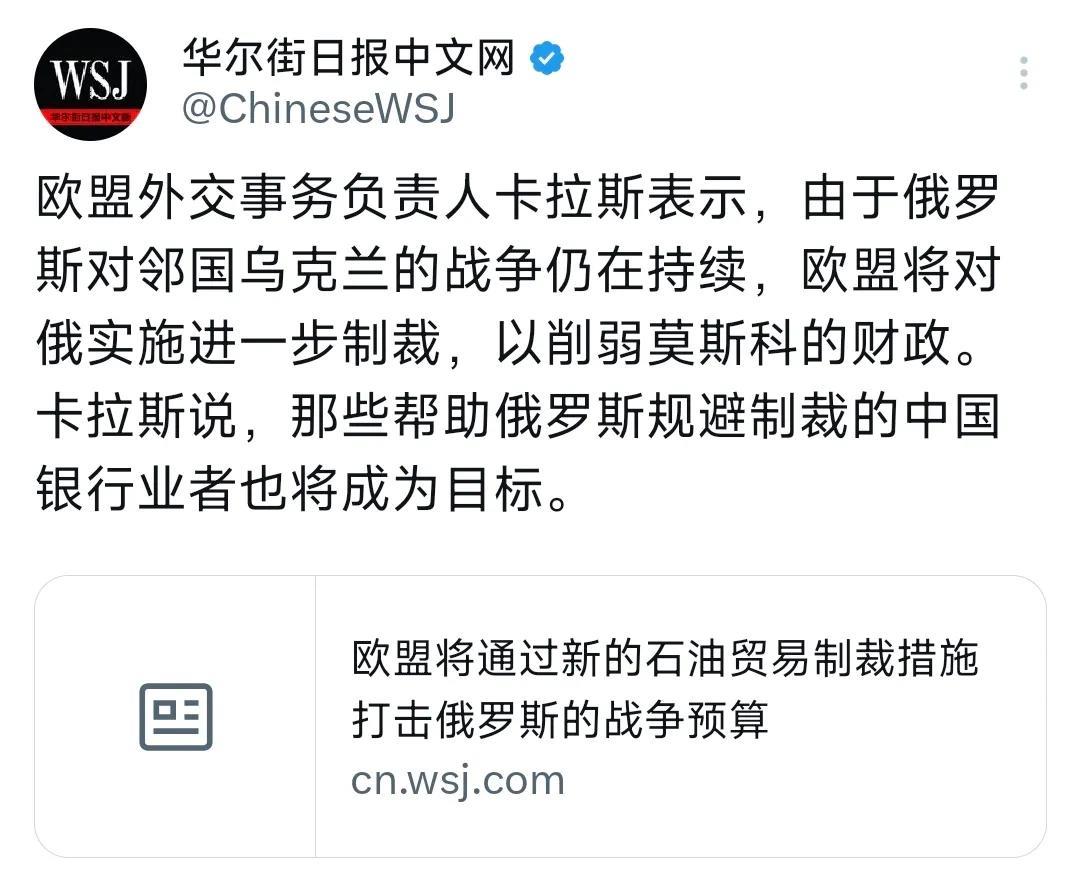 华尔街日报今天(7月19日)报道:“欧盟外交事务负责人卡拉斯表示,由于俄罗斯对邻