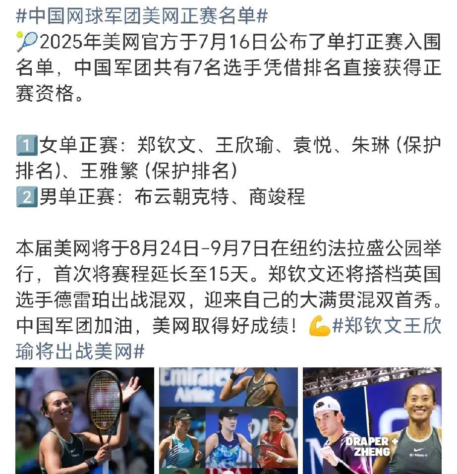 美网正赛名单公布! 女单top10整整齐齐,无人缺席。 头号种子萨巴伦卡退出蒙特利尔1000赛,正为美网蓄力,一个月后即将开启美网卫冕之旅。 而去年的赛会亚军佩古拉正在参加美网热身赛——华盛顿500赛。 中国军团入围5人,分别是郑钦文、王欣瑜、袁悦、朱琳、王雅繁。 郑钦文这次除了单打,还要搭档“英国一哥”、“网坛男模”德雷珀参加混双。 8月24日,美网开打,一起为郑钦文加油吧,期待硬地有大的突破!