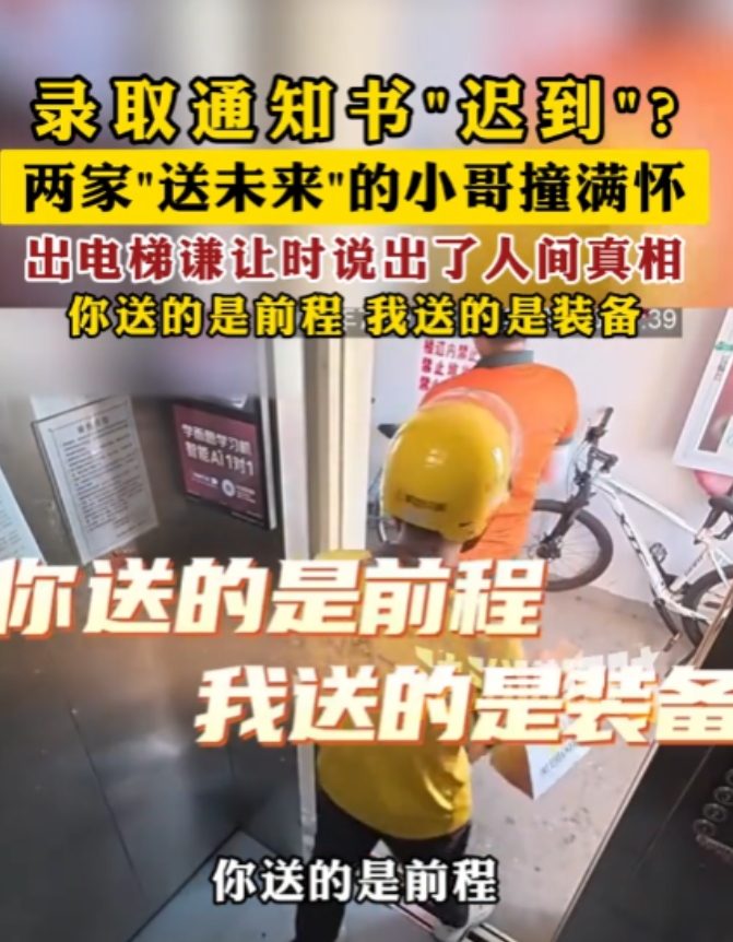 信息来源:《录取通知书"迟到"? 两家"送未来"的小哥撞满怀 出电梯谦让时说出了人间真相 你送的是前程 我送的是装备》法治进行时