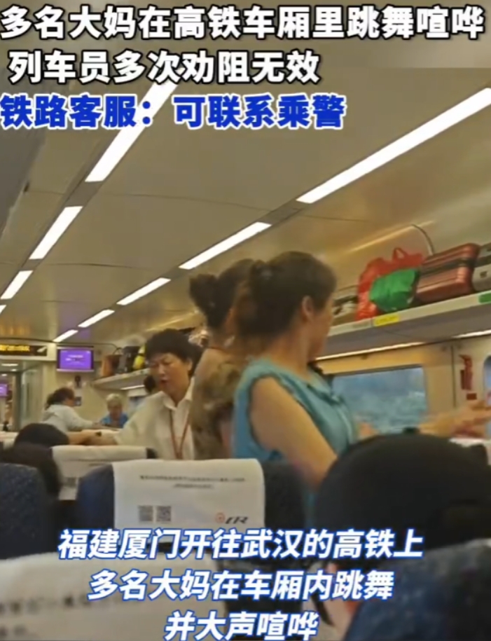 17号那天,从厦门开去武汉的高铁上,好几名大妈在车厢里头,放着音乐就跳起舞来,嗓门还特别大,从上车一直闹到终点站,周围乘客想好好歇会儿都不行。