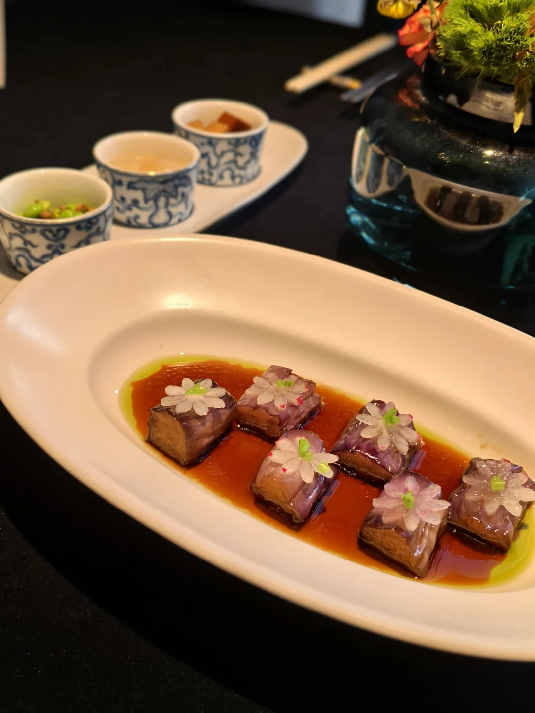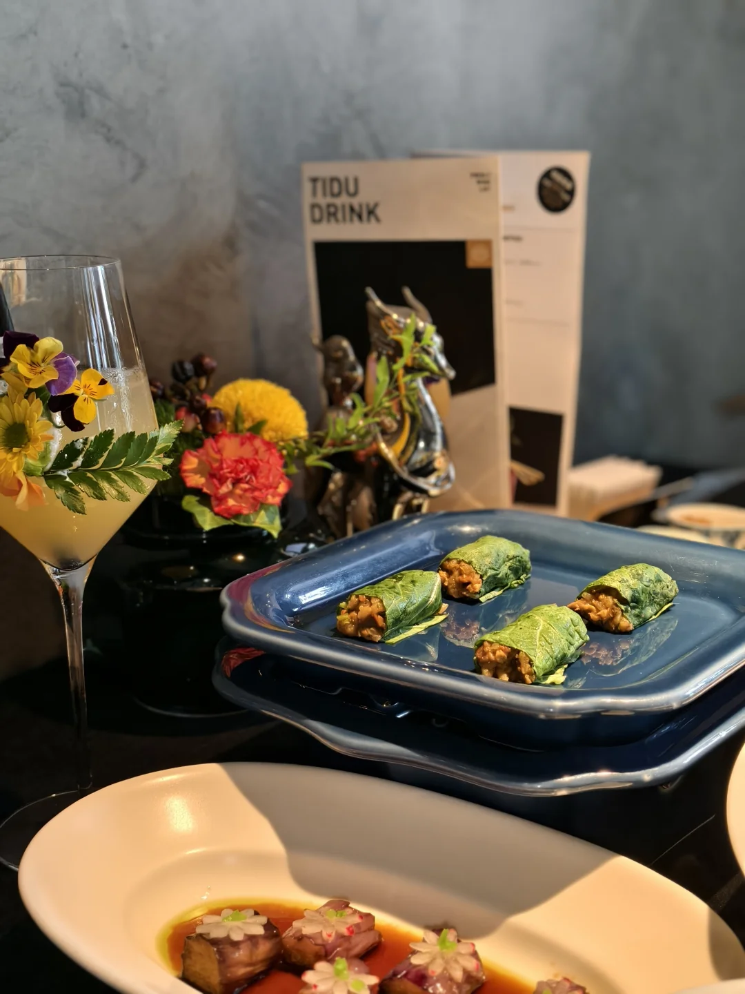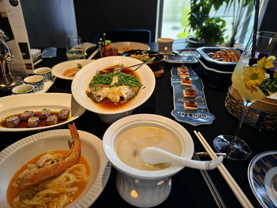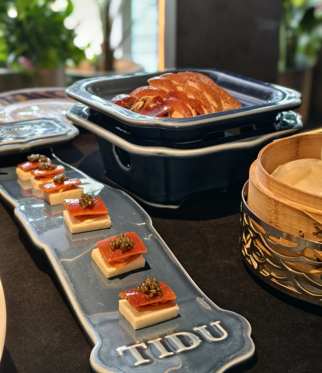上周找朋友玩,然后去试了试提督·TIDU 和 常龙山联合出品的烤鸭新三吃 第一次听说烤鸭大饭包,北京烤鸭也吃出来东北味。饭包外面是绿白菜叶,里面是土豆泥和茄子,融合大米与鸭腿肉,还有东北大酱的味道,香气扑鼻,感觉就像米其林精致版东北饭包 烤鸭味道一如既往的发挥稳定,鱼子酱烤鸭面包片也很好吃。鱼肚很爽口,茄子上的雕花也非常精致。餐厅氛围感满满,拍照很出片