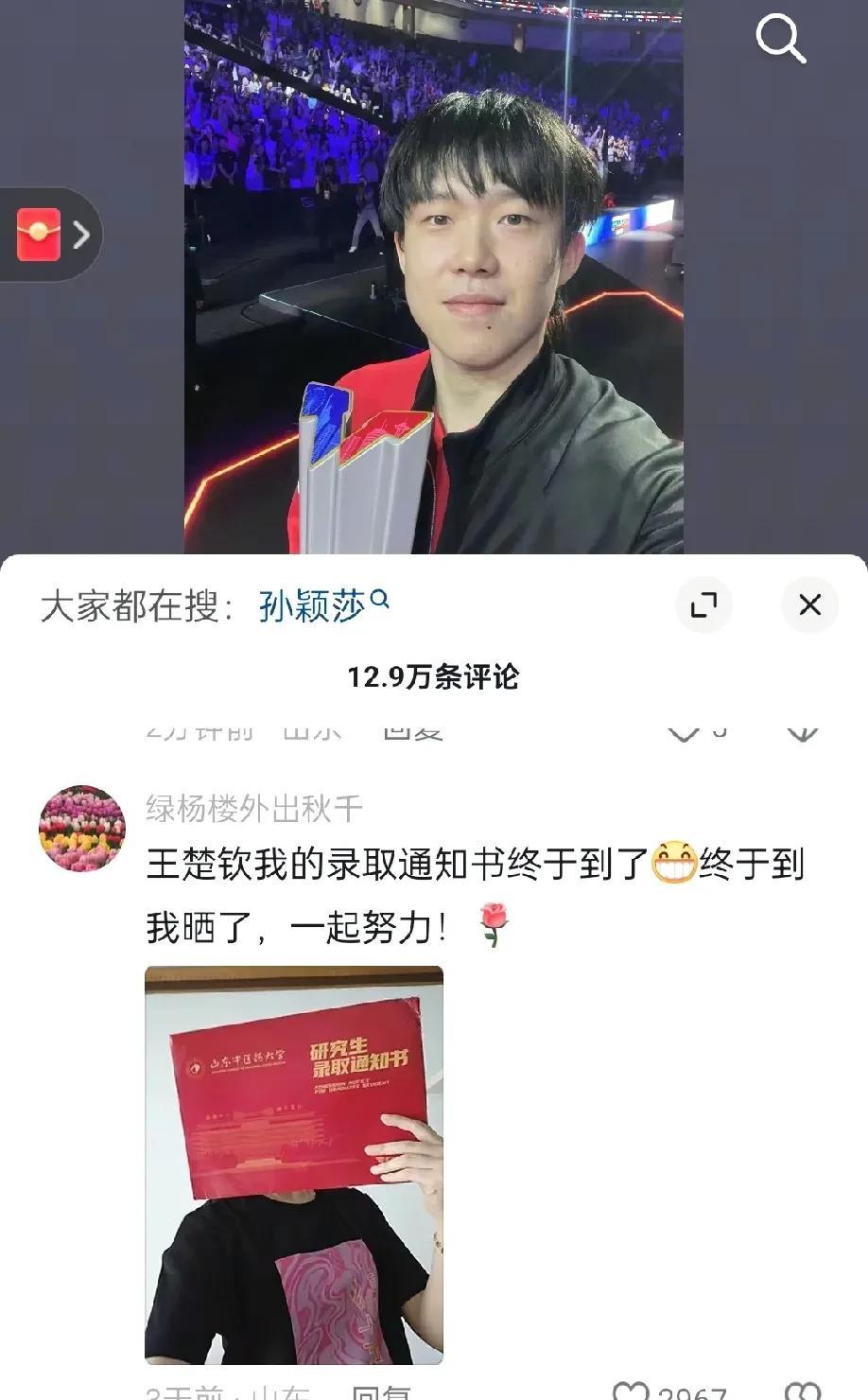有大学本科的,有硕士研究生的,有各种高中的。 作为一个孩子的母亲,特别特别理解这些孩子的喜悦,因为这是寒窗苦读多年的回报,是在十几岁的年纪,自己赢得的第一场人生比赛。 作为一个球迷,也特别特别感动,因为曾经被人骂是饭圈,而忽视了有很多很多真诚的球迷,因为喜欢王楚钦,喜欢孙颖莎,在生活、学习中获得很多很多向上的能量。 竞技体育,也许在去年夏天开始不一样了。大家记住的不是一个冠军的名字,一块金牌的样子。而是一个运动员带给自己内心深深的震撼,和向上进步的力量。 #乒乓王楚钦# #国球乒乓王楚钦#