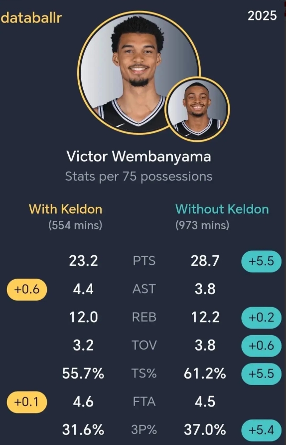2025年主要轮换球员在场/不在场时,文班每75 回合数据对比 在场时,文班数据有明显下降的有三人:哇塞索汉KJ 在场时:文班数据变化不明显的有:卡斯尔 在场时:文班数据明显大幅上涨的有:保罗巴恩斯马穆 很明显,一个好的组织后卫,一个好的能拉开空间的全能四号位,对文班都是巨大加成 而在马刺体系中越来越尴尬的,哇塞索汉kj需要尽快更改定位,才能更好的辅助文班