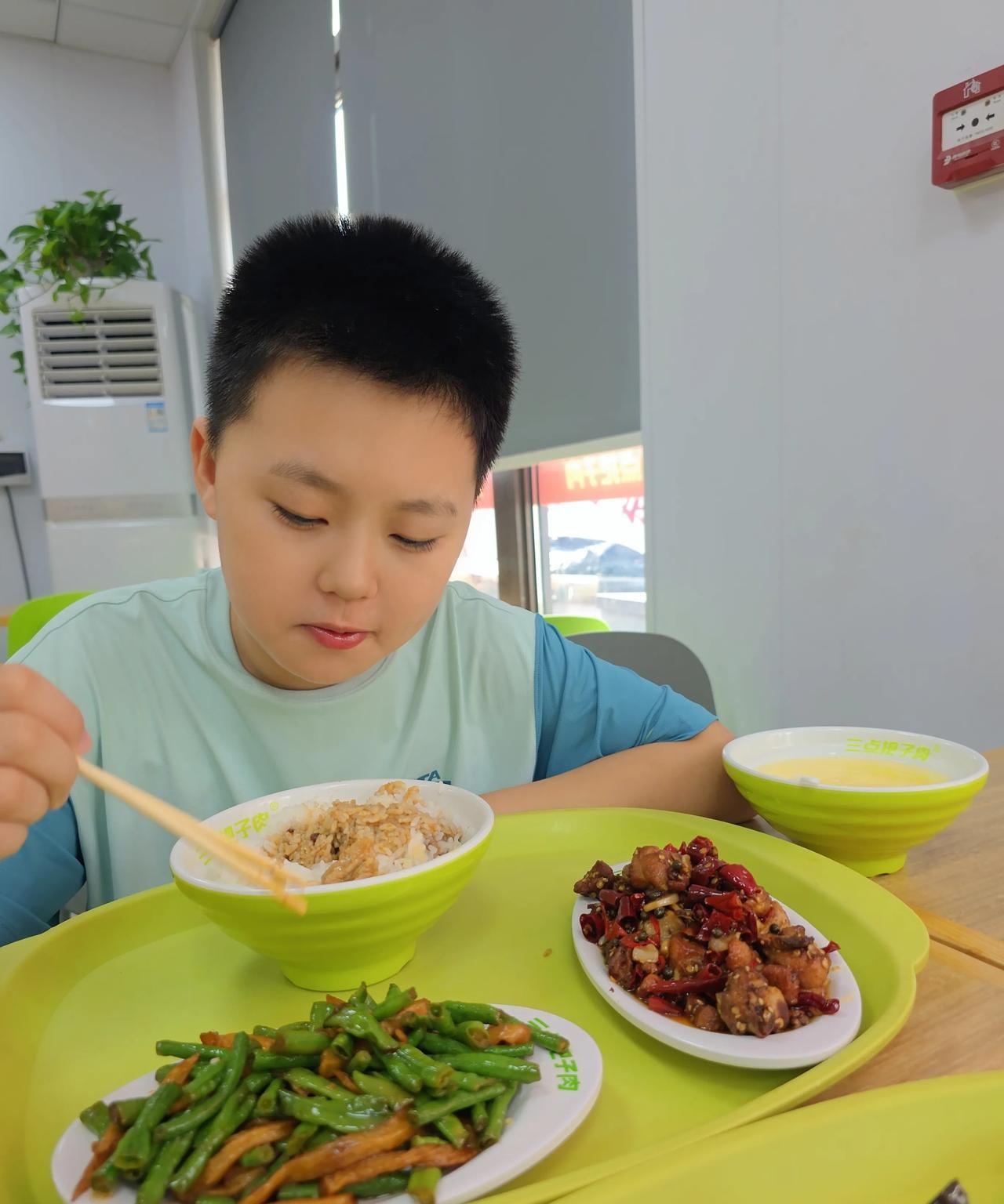 我相信,等他长大,也不忘不了这个地方…… 今天下午爸妈就来接他。中午问他想吃啥,他说:“再吃快餐吧,我明天就回去了,又要很长时间吃不到他家的饭菜。”看来孩子也有念旧意识了,长大了。 他喜欢这里的快餐,是因为可选择的东西多,一二十个菜中,总有一个他最喜欢吃的。 一碗米饭,一份辣子鸡,一份香菇豆角,一碗玉米粥,这是他给自己选的。然后又建议我选木须肉、辣椒炒肉和红烧茄子,这也是他比较爱吃的,放在我的盘子里,他也吃。 这孩子吃饭不用操心,这是在学校养成的好习惯,不一会儿的功夫米就饭吃完了,还清了一盘菜。一边吃一边说:“姥爷,咱晚上带我妈来吃吧,别在家做了。”自己吃饭还惦记着妈妈晚上吃什么,让人欣慰。 吃过饭回家路上,我问他这一周开心不开心。他说:“开心,很开心。不是因为你不管我开心,是我在哪里都开心。”这话忽然让我羡慕起他来,无论在哪里都开心,无忧无虑的,这才是成年人渴望的境界呀。 #头号创作者激励计划#