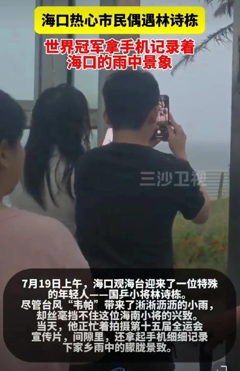 乒乓球团体世界冠军、男单世界排名第一林诗栋今日回到家乡海南省海口市,参与录制家乡媒体主办的第十五届全运会宣传活动。今天海口看来是台风天气,林诗栋不只为家乡媒体录制口播,还兴致勃勃的拿着手机拍摄外面的台风天气! 包括林诗栋在内的国乒主力们将在7月25集合于厦门开始乒超联赛第二阶段比赛。
