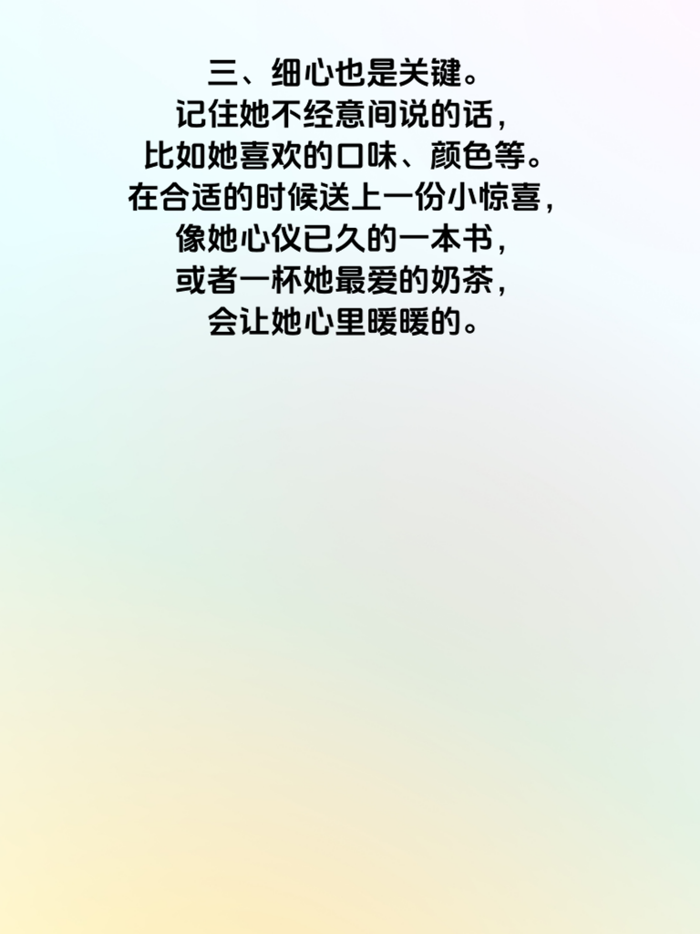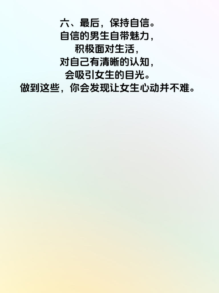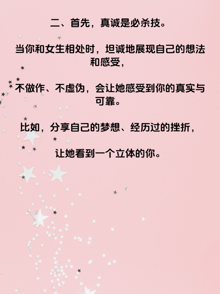 一、在爱情的世界里,男生们总是渴望能找到让女生心动的秘诀。其实,一些看似简单的行为,往往能产生意想不到的效果。 二、首先,真诚是必杀技。当你和女生相处时,坦诚地展现自己的想法和感受,不做作、不虚伪,会让她感受到你的真实与可靠。比如,分享自己的梦想、经历过的挫折,让她看到一个立体的你。 三、细心也是关键。记住她不经意间说的话,比如她喜欢的口味、颜色等。在合适的时候送上一份小惊喜,像她心仪已久的一本书,或者一杯她最爱的奶茶,会让她心里暖暖的。 四、懂得倾听同样重要。当她倾诉烦恼时,耐心地听她讲完,给予安慰和支持。不要急于发表自己的看法,让她感受到你对她情绪的重视。 五、还有,展现绅士风度。为她开门、拉椅子,在人多的地方护着她。这些小举动会让她觉得自己备受呵护。 六、最后,保持自信。自信的男生自带魅力,积极面对生活,对自己有清晰的认知,会吸引女生的目光。做到这些,你会发现让女生心动并不难。