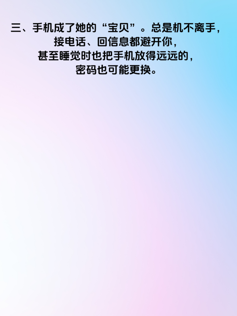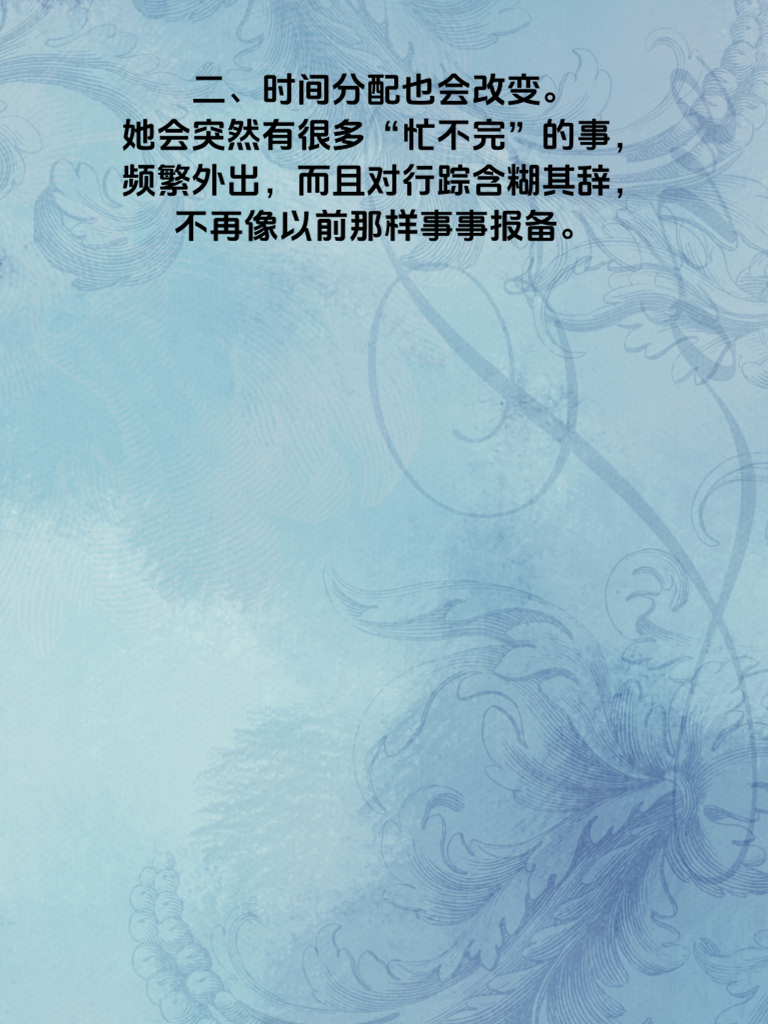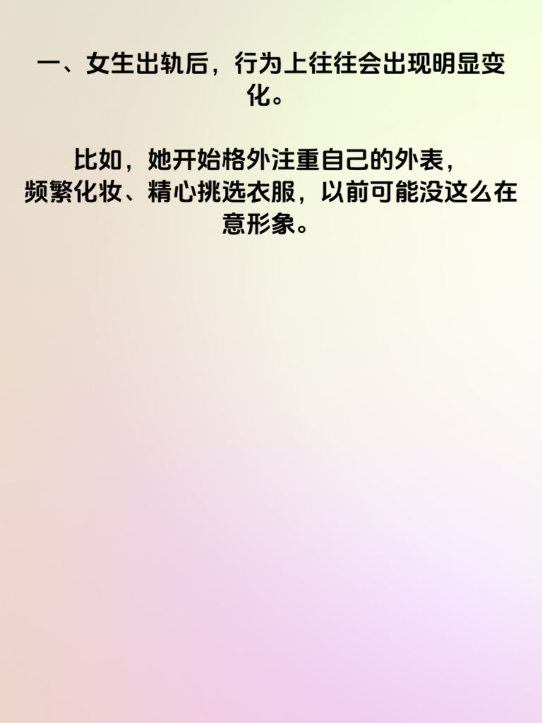 一、女生出轨后,行为上往往会出现明显变化。比如,她开始格外注重自己的外表,频繁化妆、精心挑选衣服,以前可能没这么在意形象。 二、时间分配也会改变。她会突然有很多“忙不完”的事,频繁外出,而且对行踪含糊其辞,不再像以前那样事事报备。 三、手机成了她的“宝贝”。总是机不离手,接电话、回信息都避开你,甚至睡觉时也把手机放得远远的,密码也可能更换。 四、对你的态度也大不相同。变得不耐烦,经常挑刺,不再像以前那样温柔体贴,两人相处时气氛变得压抑。 五、性生活方面也能察觉。她可能突然变得冷淡,找各种借口拒绝亲密接触,态度和以前判若两人。若你发现这些信号,要冷静思考,沟通交流,弄清楚背后的原因,别盲目猜疑,也别轻易忽视感情中的危机。