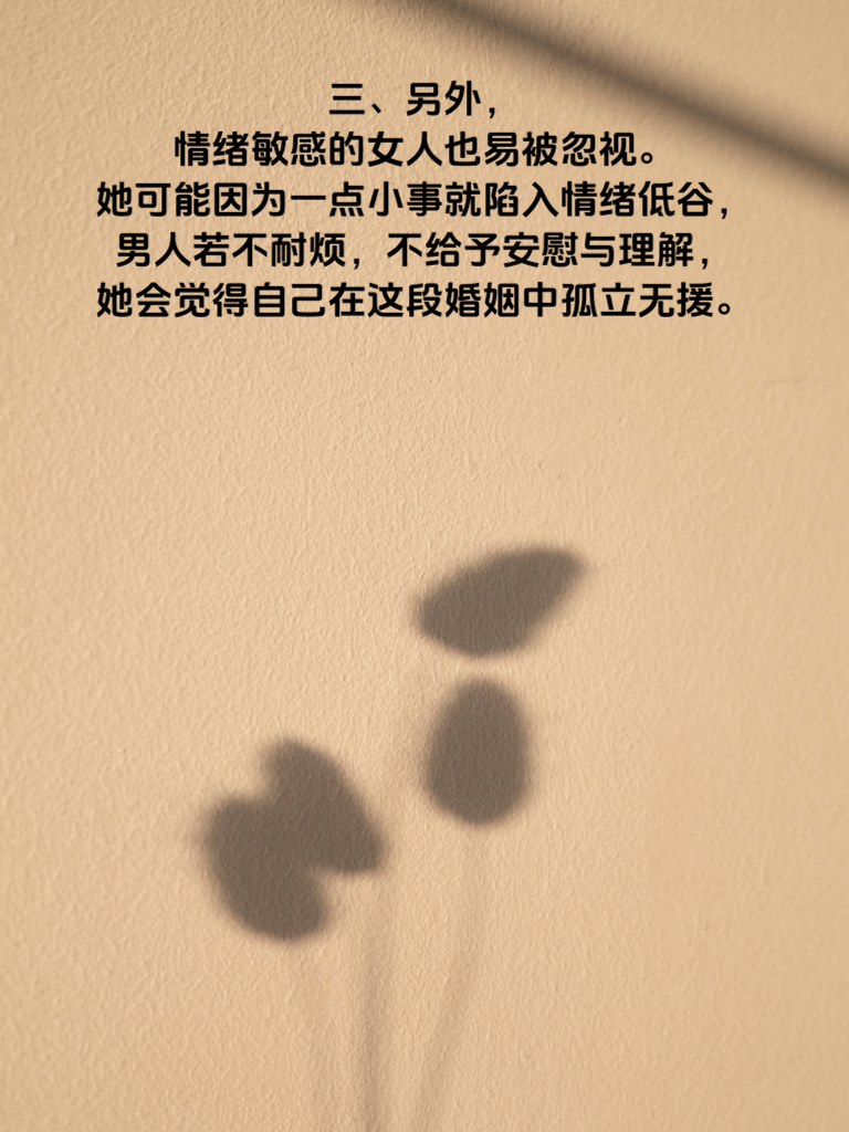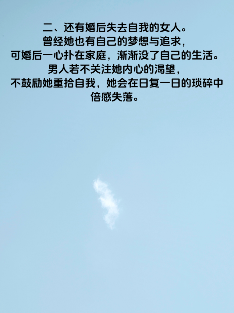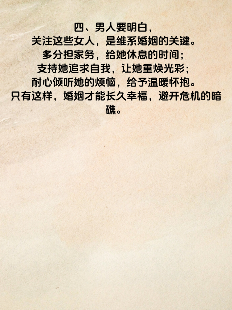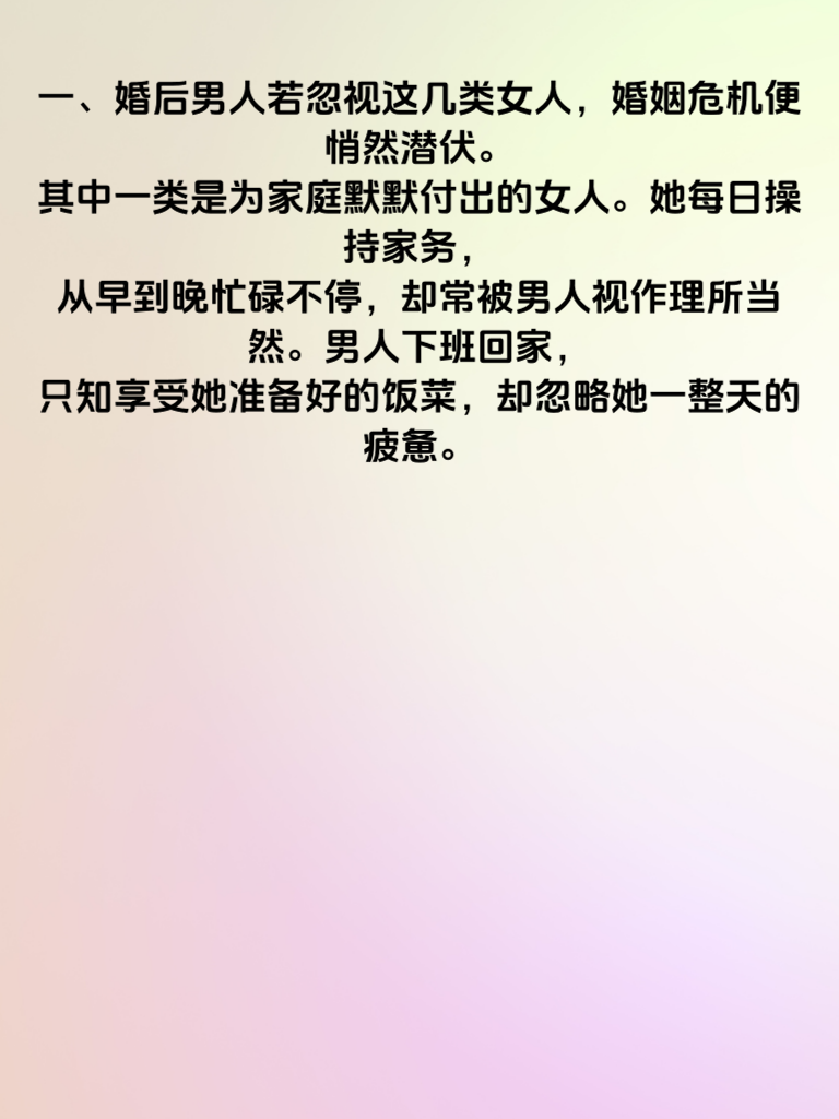 一、婚后男人若忽视这几类女人,婚姻危机便悄然潜伏。其中一类是为家庭默默付出的女人。她每日操持家务,从早到晚忙碌不停,却常被男人视作理所当然。男人下班回家,只知享受她准备好的饭菜,却忽略她一整天的疲惫。 二、还有婚后失去自我的女人。曾经她也有自己的梦想与追求,可婚后一心扑在家庭,渐渐没了自己的生活。男人若不关注她内心的渴望,不鼓励她重拾自我,她会在日复一日的琐碎中倍感失落。 三、另外,情绪敏感的女人也易被忽视。她可能因为一点小事就陷入情绪低谷,男人若不耐烦,不给予安慰与理解,她会觉得自己在这段婚姻中孤立无援。 四、男人要明白,关注这些女人,是维系婚姻的关键。多分担家务,给她休息的时间;支持她追求自我,让她重焕光彩;耐心倾听她的烦恼,给予温暖怀抱。只有这样,婚姻才能长久幸福,避开危机的暗礁。