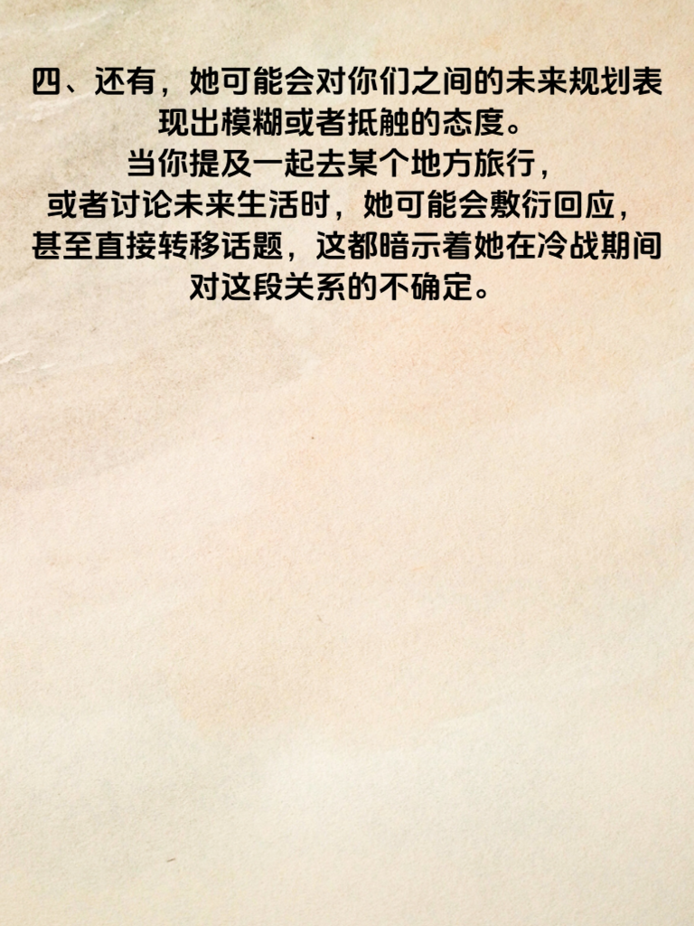 一、女性冷战后,常常会有一些暗示信号。其中一个常见的表现是,她可能会开始减少主动与你交流的频率。原本每天都会分享生活点滴的她,突然变得沉默寡言。比如,以前她会主动给你发消息说今天遇到了什么有趣的事,现在却好几天都没有动静。 二、在行为上,她可能会刻意回避与你见面的场合。以往你们经常一起去的餐厅、公园,她会找各种借口推脱。比如,你约她周末一起去看电影,她可能会说自己有事要忙。 三、她对你们之间共同的朋友也会有不同态度。可能不再像以前那样积极参与你们共同朋友组织的聚会,或者在聚会中表现得很冷淡。这其实是她内心情绪的一种外在体现,暗示着她还在冷战的情绪中没有走出来。 四、还有,她可能会对你们之间的未来规划表现出模糊或者抵触的态度。当你提及一起去某个地方旅行,或者讨论未来生活时,她可能会敷衍回应,甚至直接转移话题,这都暗示着她在冷战期间对这段关系的不确定。