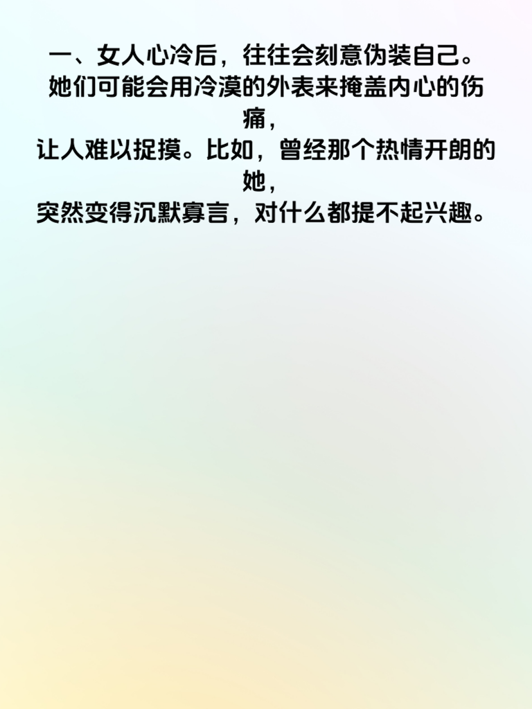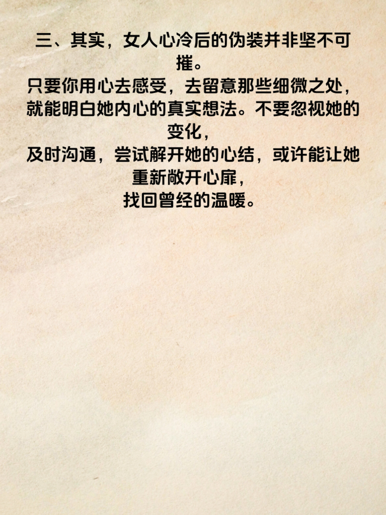 一、女人心冷后,往往会刻意伪装自己。她们可能会用冷漠的外表来掩盖内心的伤痛,让人难以捉摸。比如,曾经那个热情开朗的她,突然变得沉默寡言,对什么都提不起兴趣。 二、然而,一些细节能揭穿她们的伪装。当你发现她不再像以前那样关心你的生活,对你的事情变得敷衍,这可能就是心冷的表现。又或者,她开始避免和你有过多的眼神交流,总是有意无意地躲开你。 三、其实,女人心冷后的伪装并非坚不可摧。只要你用心去感受,去留意那些细微之处,就能明白她内心的真实想法。不要忽视她的变化,及时沟通,尝试解开她的心结,或许能让她重新敞开心扉,找回曾经的温暖。