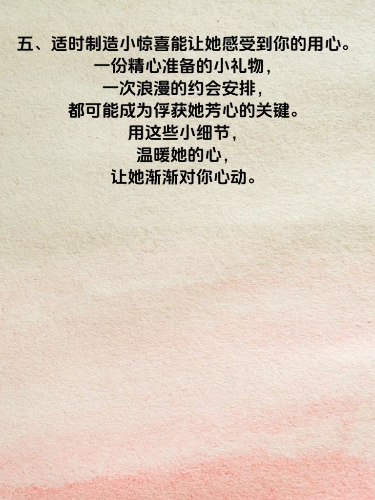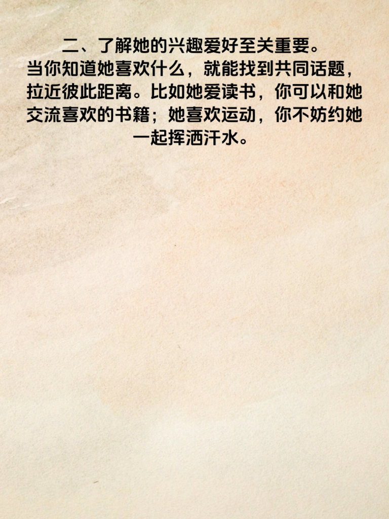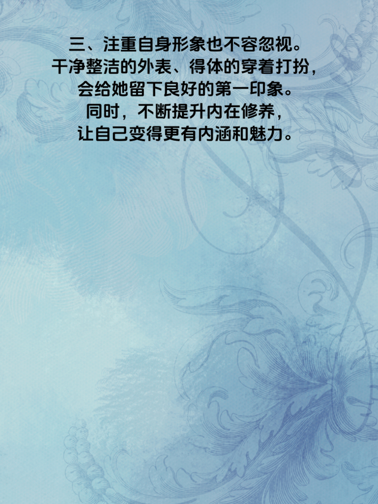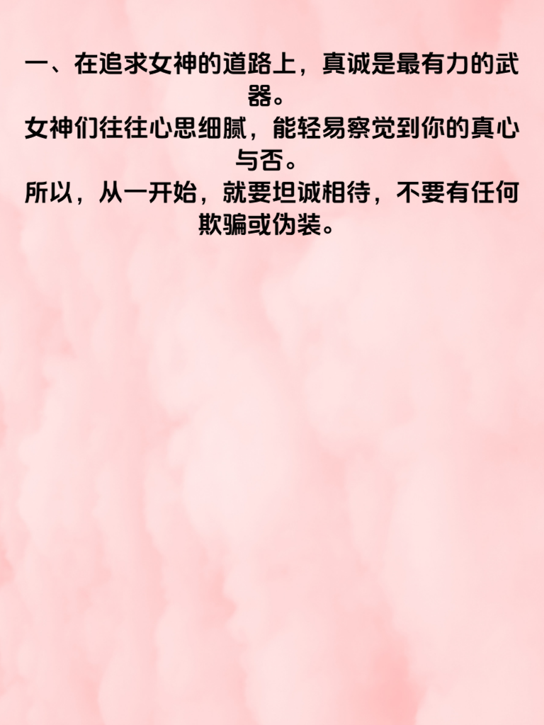 一、在追求女神的道路上,真诚是最有力的武器。女神们往往心思细腻,能轻易察觉到你的真心与否。所以,从一开始,就要坦诚相待,不要有任何欺骗或伪装。 二、了解她的兴趣爱好至关重要。当你知道她喜欢什么,就能找到共同话题,拉近彼此距离。比如她爱读书,你可以和她交流喜欢的书籍;她喜欢运动,你不妨约她一起挥洒汗水。 三、注重自身形象也不容忽视。干净整洁的外表、得体的穿着打扮,会给她留下良好的第一印象。同时,不断提升内在修养,让自己变得更有内涵和魅力。 四、尊重她的想法和选择。不要强行把自己的意愿加在她身上,遇到分歧时,心平气和地沟通,倾听她的观点,展现出你的包容与理解。 五、适时制造小惊喜能让她感受到你的用心。一份精心准备的小礼物,一次浪漫的约会安排,都可能成为俘获她芳心的关键。用这些小细节,温暖她的心,让她渐渐对你心动。