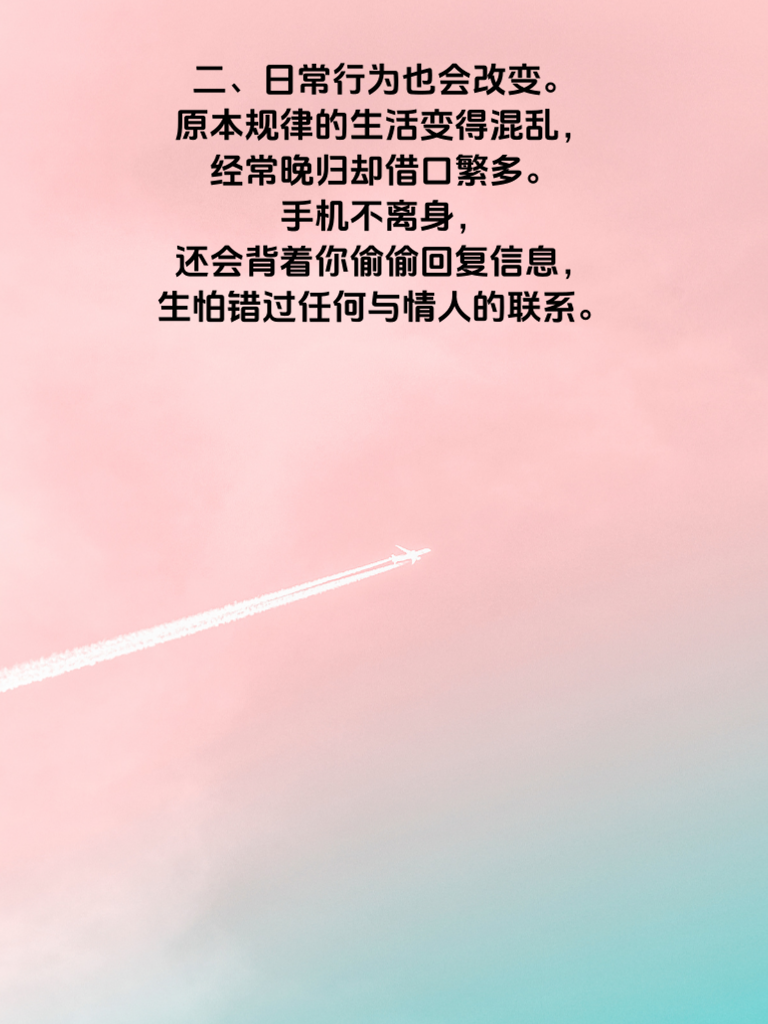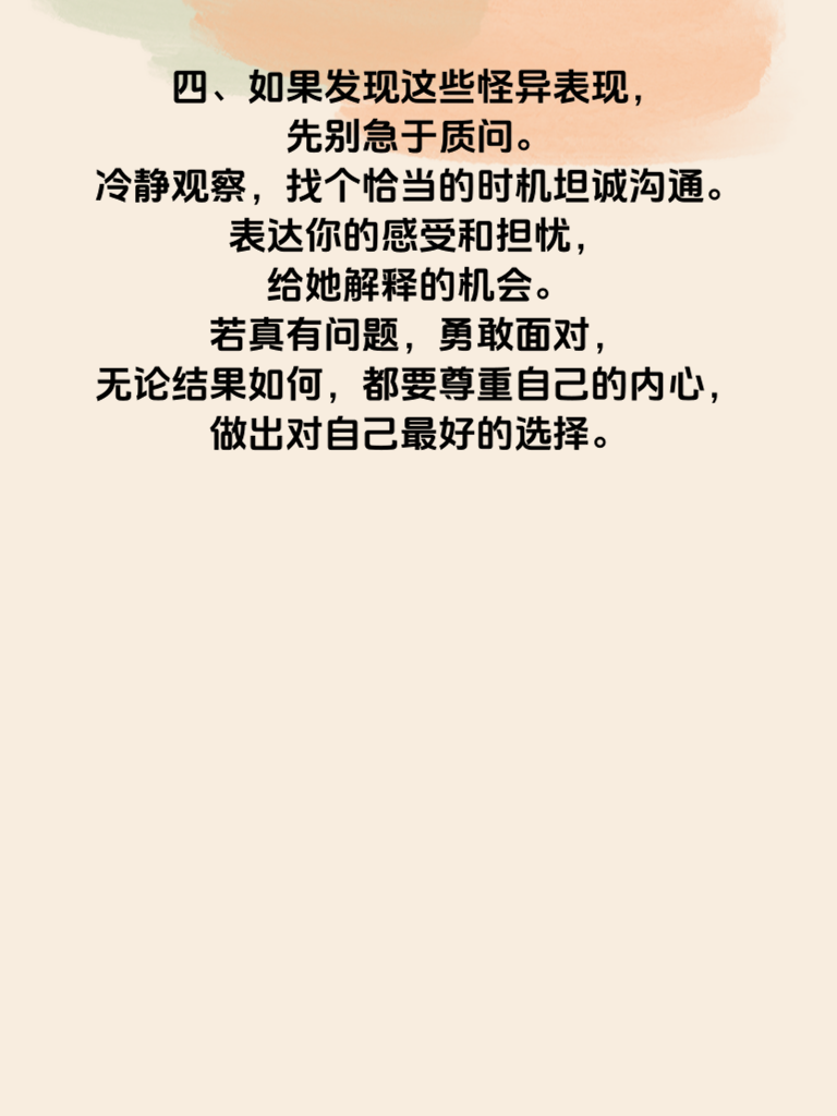 一、女人出轨前,生活总会出现一些怪异的迹象。她们开始格外注重外表,频繁化妆、精心挑选衣服,仿佛要去赴一场重要约会。这或许是因为她渴望在他人眼中展现更好的自己,为新的感情做准备。 二、日常行为也会改变。原本规律的生活变得混乱,经常晚归却借口繁多。手机不离身,还会背着你偷偷回复信息,生怕错过任何与情人的联系。 三、对亲密关系的态度也悄然生变。她不再像以前那样热情回应你的拥抱和亲吻,甚至开始挑剔你的小毛病,为的是给自己找借口拉开与你的距离。 四、如果发现这些怪异表现,先别急于质问。冷静观察,找个恰当的时机坦诚沟通。表达你的感受和担忧,给她解释的机会。若真有问题,勇敢面对,无论结果如何,都要尊重自己的内心,做出对自己最好的选择。