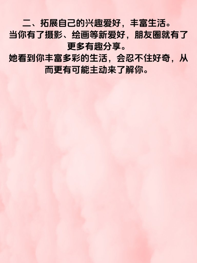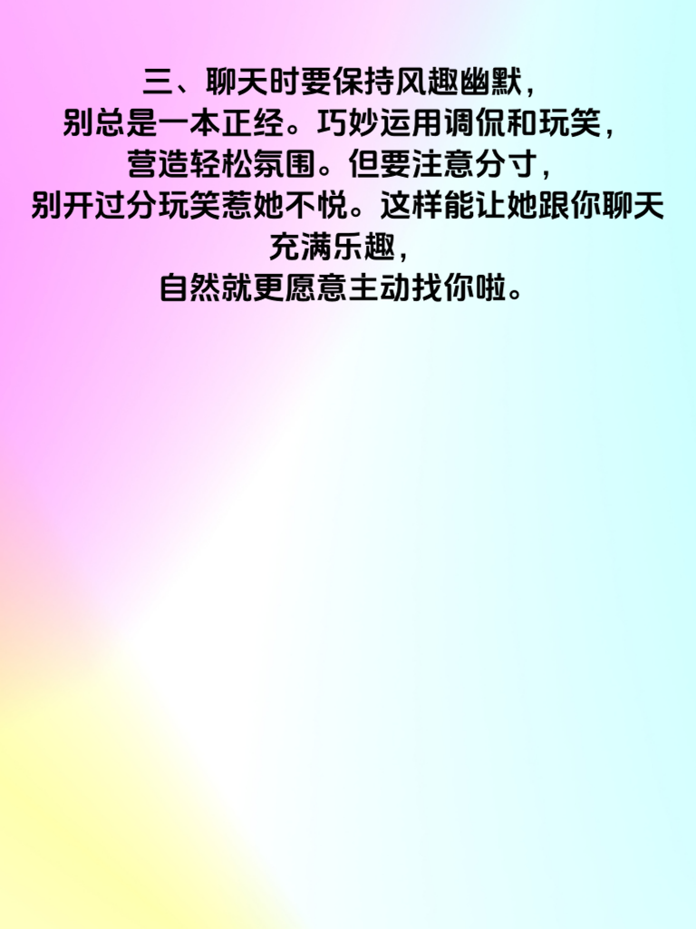 一、想要让女生主动找你,第一步是要打造独特个人形象。不必刻意伪装,展现真实且有闪光点的自己。比如你热爱运动,那就积极参与各类活动,不经意间秀出运动风采,让她看到你的活力与热情。 二、拓展自己的兴趣爱好,丰富生活。当你有了摄影、绘画等新爱好,朋友圈就有了更多有趣分享。她看到你丰富多彩的生活,会忍不住好奇,从而更有可能主动来了解你。 三、聊天时要保持风趣幽默,别总是一本正经。巧妙运用调侃和玩笑,营造轻松氛围。但要注意分寸,别开过分玩笑惹她不悦。这样能让她跟你聊天充满乐趣,自然就更愿意主动找你啦。 四、偶尔适当“失踪”一下,别整天围着她转。专注自己的事情,让她意识到你的生活不是只有她。她会因此重新审视你,可能就会主动来找你,看看你在忙啥。