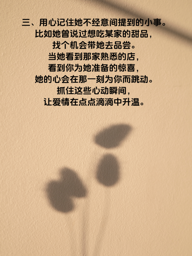 一、在追求女友的旅程中,抓住她的心动瞬间至关重要。那一瞬间,可能是一个温暖的微笑,可能是一次贴心的举动。比如,在寒冷的冬日,为她准备一杯热气腾腾的奶茶,看着她双手捧着奶茶时眼中的惊喜,那就是一个心动瞬间。 二、要善于观察她的喜好和兴趣。如果她喜欢看电影,那就提前了解近期有她感兴趣的影片,精心安排一场专属的电影约会。在观影过程中,适时递上纸巾,在感人情节处轻轻拍拍她的肩膀给予安慰,这些细节都可能成为触动她心弦的瞬间。 三、用心记住她不经意间提到的小事。比如她曾说过想吃某家的甜品,找个机会带她去品尝。当她看到那家熟悉的店,看到你为她准备的惊喜,她的心会在那一刻为你而跳动。抓住这些心动瞬间,让爱情在点点滴滴中升温。