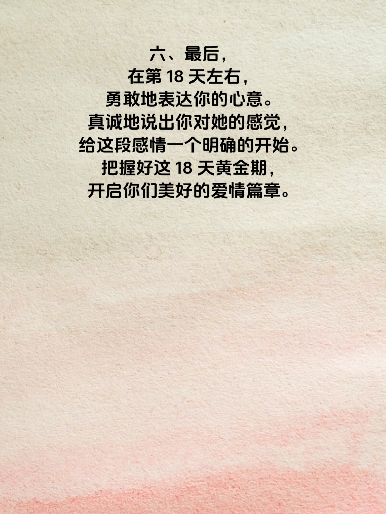 一、在追求女生的旅程中,有一个18天的黄金期,宛如千载难逢的机遇,等待着有心人的把握。这18天,是感情升温的关键时段,能否抓住,决定了你与她故事的走向。 二、最初的几天,要积极展现你的真诚与热情。主动打招呼,关心她的生活点滴,但别过度打扰。比如,问问她今天过得怎样,有没有遇到有趣的事。 三、接着,深入了解她的兴趣爱好。陪她去做喜欢的事,看她爱看的电影,听她爱听的音乐。共同的兴趣能迅速拉近你们的距离。 四、在这18天里,适时制造一些小惊喜。不需要多贵重,一束鲜花、一份小点心,就能让她心里泛起涟漪。 五、注意自己的言行举止,保持绅士风度。尊重她的意见,认真倾听她说话,让她感受到被重视。 六、最后,在第18天左右,勇敢地表达你的心意。真诚地说出你对她的感觉,给这段感情一个明确的开始。把握好这18天黄金期,开启你们美好的爱情篇章。