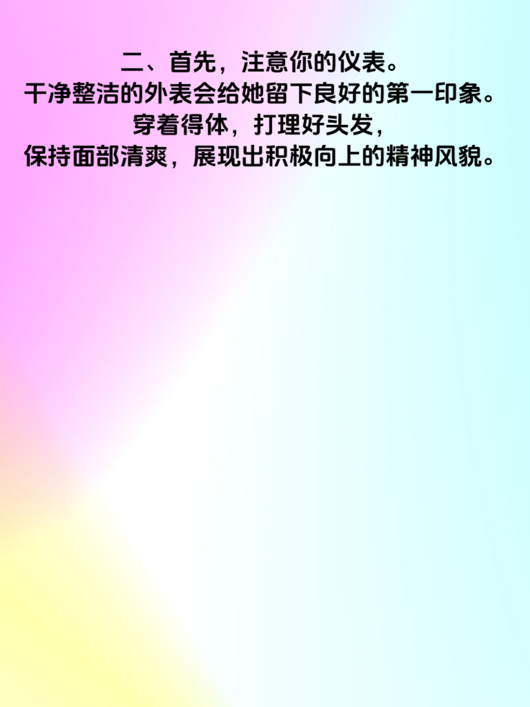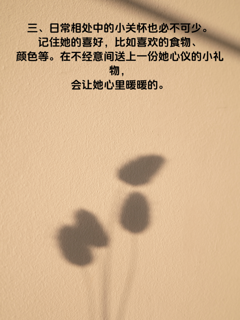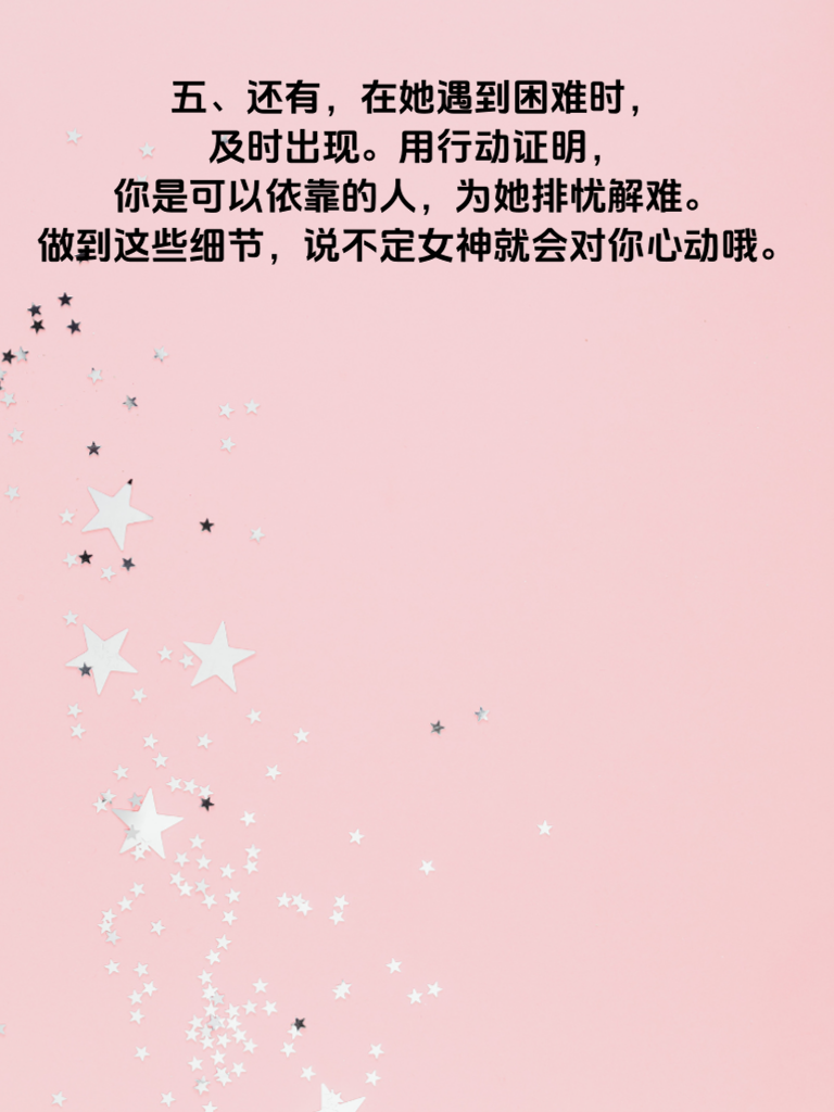 一、追求女神,细节决定成败。想要让她心动,可不能只靠花言巧语,一些关键细节往往能起到决定性作用。 二、首先,注意你的仪表。干净整洁的外表会给她留下良好的第一印象。穿着得体,打理好头发,保持面部清爽,展现出积极向上的精神风貌。 三、日常相处中的小关怀也必不可少。记住她的喜好,比如喜欢的食物、颜色等。在不经意间送上一份她心仪的小礼物,会让她心里暖暖的。 四、聊天时要专注倾听,给予她充分的尊重。不要总是自顾自地说,适时回应她的观点,让她感受到被重视。 五、还有,在她遇到困难时及时出现。用行动证明你是可以依靠的人,为她排忧解难。做到这些细节,说不定女神就会对你心动哦。