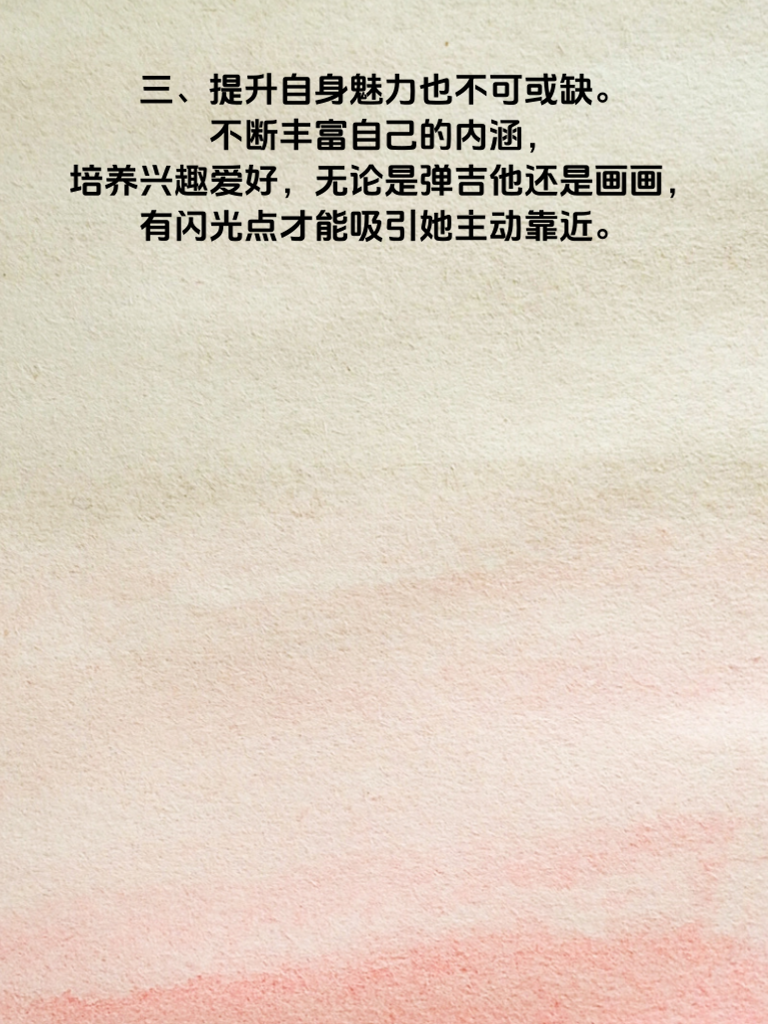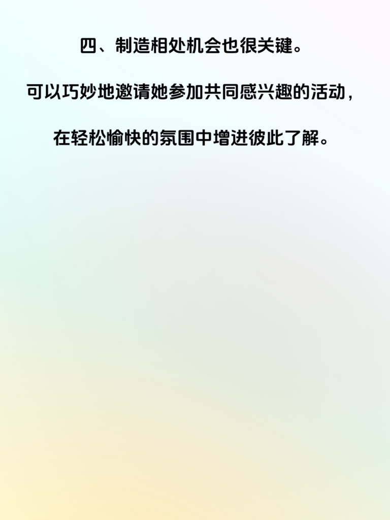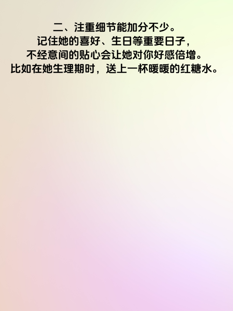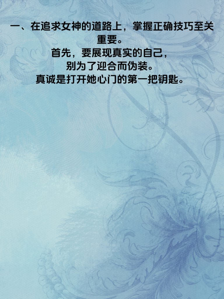 一、在追求女神的道路上,掌握正确技巧至关重要。首先,要展现真实的自己,别为了迎合而伪装。真诚是打开她心门的第一把钥匙。 二、注重细节能加分不少。记住她的喜好、生日等重要日子,不经意间的贴心会让她对你好感倍增。比如在她生理期时,送上一杯暖暖的红糖水。 三、提升自身魅力也不可或缺。不断丰富自己的内涵,培养兴趣爱好,无论是弹吉他还是画画,有闪光点才能吸引她主动靠近。 四、制造相处机会也很关键。可以巧妙地邀请她参加共同感兴趣的活动,在轻松愉快的氛围中增进彼此了解。 五、交流时保持幽默风趣。适时开个小玩笑,让她在和你相处时充满欢笑,这样她会更愿意和你待在一起,甚至可能主动向你示爱哦。