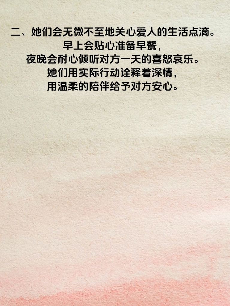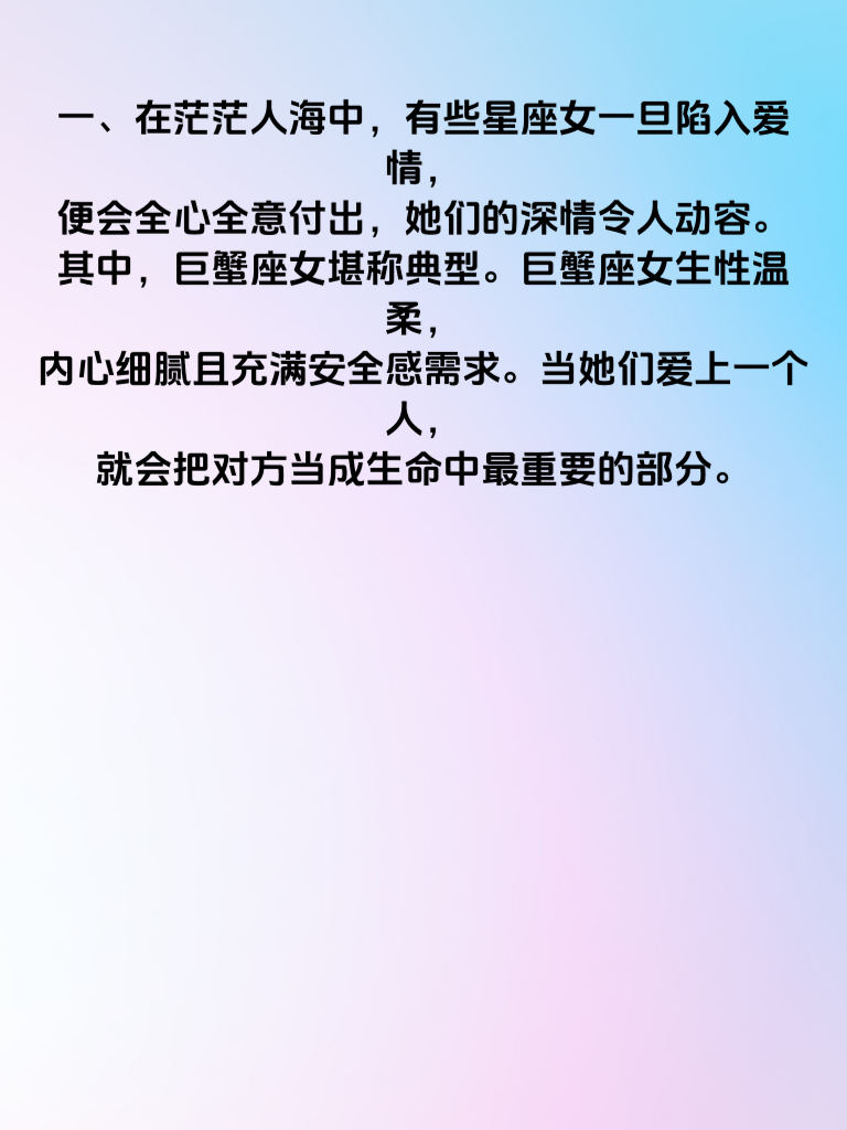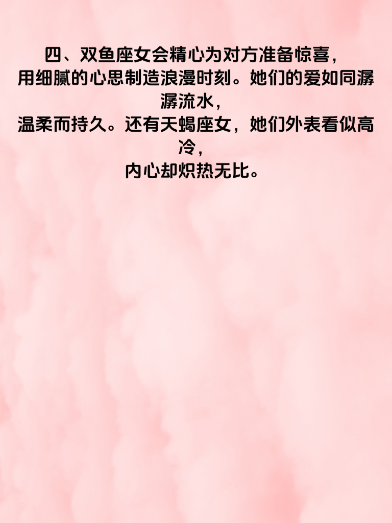 一、在茫茫人海中,有些星座女一旦陷入爱情,便会全心全意付出,她们的深情令人动容。其中,巨蟹座女堪称典型。巨蟹座女生性温柔,内心细腻且充满安全感需求。当她们爱上一个人,就会把对方当成生命中最重要的部分。 二、她们会无微不至地关心爱人的生活点滴。早上会贴心准备早餐,夜晚会耐心倾听对方一天的喜怒哀乐。她们用实际行动诠释着深情,用温柔的陪伴给予对方安心。 三、双鱼座女也是深情的代表。她们情感丰富,充满浪漫幻想。一旦坠入爱河,便会沉浸在自己编织的甜蜜梦境中。为了爱人,她们愿意付出一切,哪怕牺牲自己的利益。 四、双鱼座女会精心为对方准备惊喜,用细腻的心思制造浪漫时刻。她们的爱如同潺潺流水,温柔而持久。还有天蝎座女,她们外表看似高冷,内心却炽热无比。 五、当天蝎座女爱上一个人,就会坚定不移。她们会忠诚地对待感情,为了维护爱情全力以赴。遇到这几个星座女,若有幸被她们深爱,一定要好好珍惜这份深情。