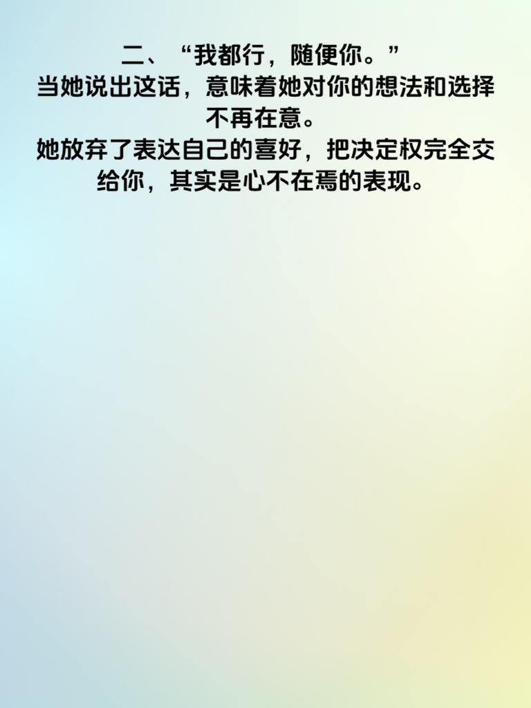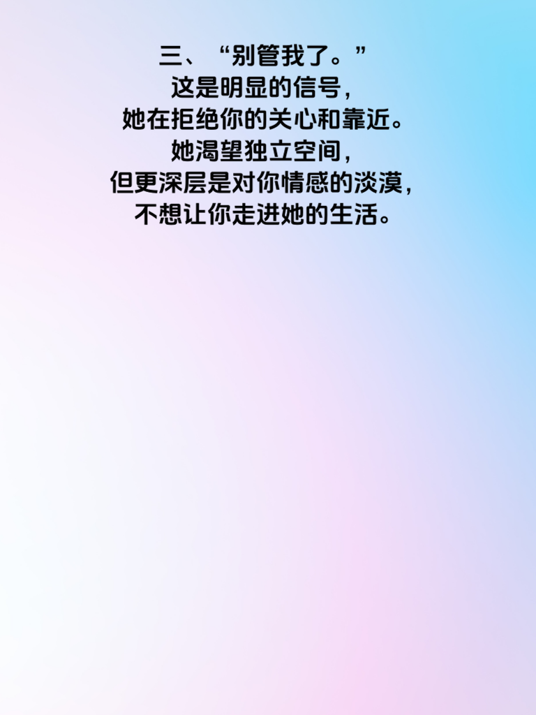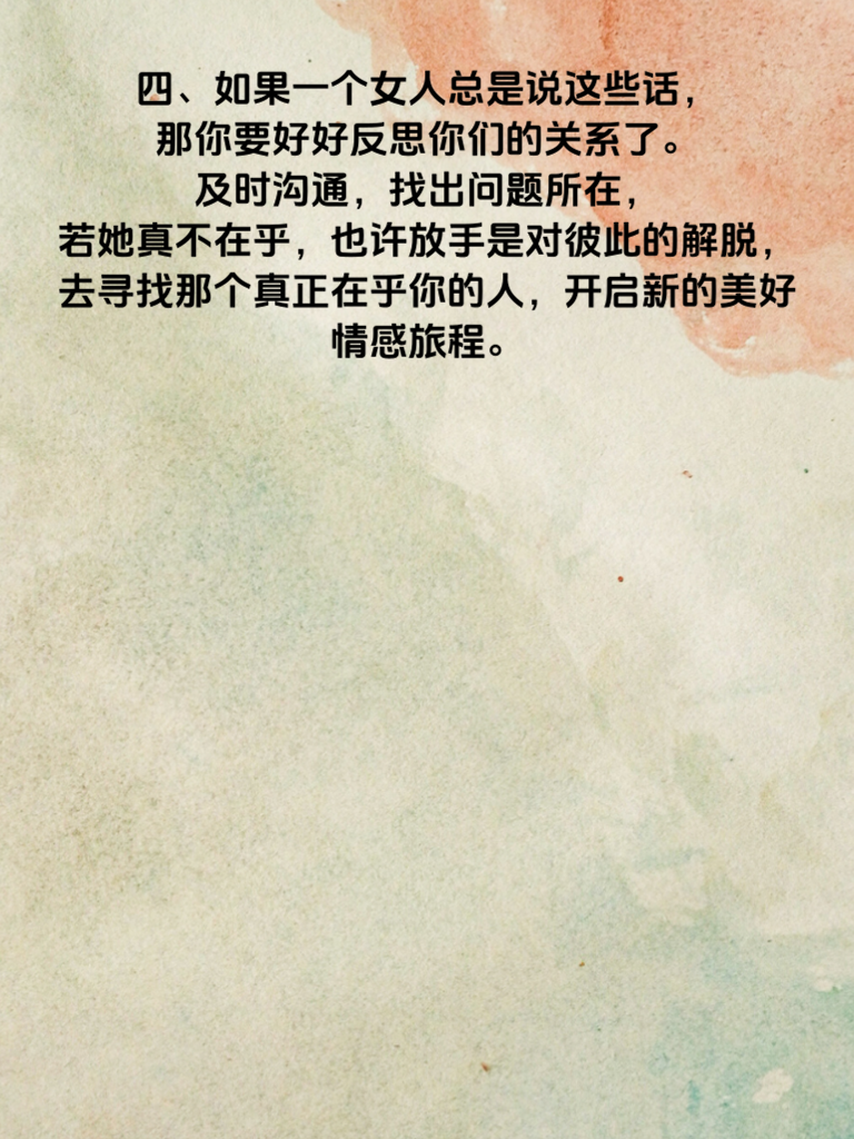 一、女人不在乎你时,常常会说:“你忙你的吧。”这句话看似平淡,实则暗藏疏离。她不再关心你的行踪,对你的忙碌无动于衷,仿佛你的世界与她无关。 二、“我都行,随便你。”当她说出这话,意味着她对你的想法和选择不再在意。她放弃了表达自己的喜好,把决定权完全交给你,其实是心不在焉的表现。 三、“别管我了。”这是明显的信号,她在拒绝你的关心和靠近。她渴望独立空间,但更深层是对你情感的淡漠,不想让你走进她的生活。 四、如果一个女人总是说这些话,那你要好好反思你们的关系了。及时沟通,找出问题所在,若她真不在乎,也许放手是对彼此的解脱,去寻找那个真正在乎你的人,开启新的美好情感旅程。