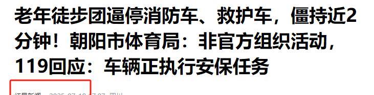 “必须严惩!”近日,辽宁朝阳,消防车和救护车执勤时,遇到老年徒步团正在列队,然而,老人们并没有礼让执勤车辆,双方僵持了大约2分钟,徒步团才离开让行!网友:倚老卖老,必须整治。 事情发生在7月中旬的上午,这支老年徒步团正在路边排练,听说要办艺术节,大家排着整齐的队伍,走得有模有样,可就在这时候,消防车和救护车过来了,警笛声 “呜呜” 地响,老远就能听见。 按说听见这动静,谁都知道是有急事,该赶紧让开,可这些排练的老人,好多人跟没听见似的,还排着队往前走,带队的也没马上让大家往边上靠,就这么让车在后面等着。 司机师傅急得一个劲儿按喇叭,旁边路过的人也喊:“快让让吧,这是消防车和救护车啊”,过了好一会儿,才有几个老人慢悠悠地往路边挪,等整个队伍都让开,足足过了两分钟。 后来119回应说,当时消防车正在执行安保任务,这可是耽误不得的事,别说两分钟了,就是几十秒都可能影响任务进度,这事儿发到网上,有人说:“排练艺术节是好事,可也不能不让路啊,这不是倚老卖老嘛!” 还有人说:“消防车、救护车执行任务,让道是应该的,这是规矩”,其实,不管是办活动还是干啥,遇到执行任务的特种车辆,都得赶紧让开。 老年人锻炼身体、参加活动值得鼓励,但可不能把公共安全忘在脑后,希望这事能给提个醒,遇到这种情况,主动让让道,这才是该有的样子。 信息来源:《老年徒步团逼停消防车、救护车,僵持近2分钟!朝阳市体育局:非官方组织活动,119回应:车辆正执行安保任务》红星新闻