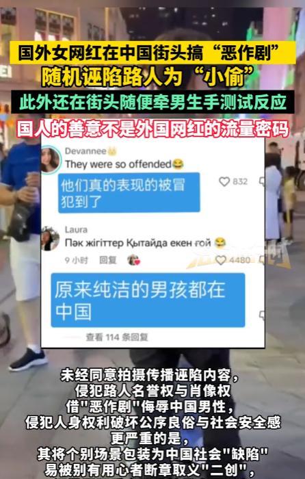 “太坏了!”7月17日,广东广州,一外国女网红以“测试中国治安”为名,随机诬陷路人是小偷,来看是否有热心人提供帮助。更过分的是,他们还在地铁、街头牵男孩子的手,以此来测试中国男人的忠诚!网友:国人的善意不能被当做“流量密码”。 这位女网红和她的团队,在街头随机挑选路人,然后毫无根据地就诬陷人家是小偷,被诬陷的路人那叫一个懵,完全不知道发生了什么,可这女网红呢,根本不管不顾,还拿着手机对着路人不停地拍。 就想记录下路人窘迫的样子,周围的人看到这一幕,也都纷纷围过来,一脸疑惑地看着这出闹剧,更过分的是,他们不只是诬陷路人,他们还在地铁、街头,做出一些非常不恰当的举动。 比如说,他们会故意去牵男孩子的手,不管人家愿不愿意,这可让那些被牵的男孩子尴尬极了,不知所措,而女网红和她的团队,却像是看笑话一样,把这一切都拍了下来。 原来,他们是想通过这些行为,来测试中国男人的忠诚,看看中国男人面对这种情况会有什么反应,他们把这些视频传到网上,就想靠这个来吸引眼球,获得流量。 这事一在网上曝光,网友们都炸了,都表示国人的善意可不是他们拿来当“流量密码”的工具,中国人向来热情好客,对外国友人也是非常友善的,可这并不代表能容忍别人这样来欺负我们、捉弄我们。 仔细想想,这名女网红的行为,已经违法了,而且,她没经过别人的同意就拍,也是不对的,说实话,中国人很欢迎外国友人到中国玩,我们是包容的国家,但这并不意味着我国的法律就不遵守了! 信息来源:《国外女网红在中国街头搞“恶作剧”随机诬陷路人为“小偷”此外还在街头随便牵男生手测试反应国人的善意不是外国网红的流量密码》法治进行时