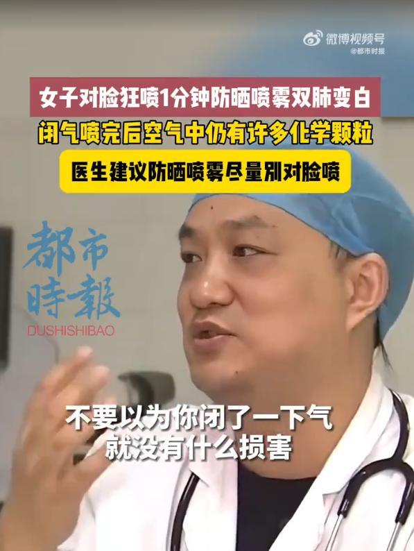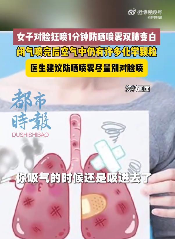 “悲剧还是发生了!”近日,江苏无锡,女子为了防晒,用防晒喷雾近距离对着脸猛喷!不料1分钟后,女子就出现剧烈咳嗽、胸闷气喘等症状,到医院拍片检查后,发现她的双肺大面积白色病变,确诊为“化学性吸入性肺炎”。网友:果然物理防晒最安全! 事情就发生在上周,女子早上出门前,想着最近太阳太毒,得好好防晒,她拿起家里常用的喷雾,凑到离脸不到10厘米的地方,对着鼻子和嘴巴猛喷了好几下,当时她也没觉得有啥不对劲,就是闻到一股酒精味。 可刚放下喷雾不到1分钟,女子突然开始止不住地咳嗽,胸口像被什么东西堵住一样,喘气得厉害,家人一看情况不对,赶紧把她送到附近的医院,医生听完她的描述,立刻安排了胸部CT检查。 片子一出来,连医生都皱起了眉头,她的双肺出现了大面积的白色病变,原来,防晒喷雾里面含有大量的酒精等成分,这东西要是近距离喷,被吸进肺里,会刺激呼吸道和肺组织。 其实,戴帽子、穿长袖这种物理防晒最靠谱,至少不会伤身体,夏天防晒确实重要,但方法不对反而会伤了自己,可别图方便就大意了,毕竟,健康可比一时的美白重要多了。 信息来源:《女子对脸狂喷1分钟防晒喷雾双肺变白》都市时报