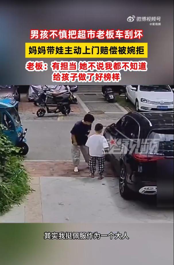 “格局打开了!”7月16日,河北张家口,小男孩推电动车时不慎摔倒,刮到了一旁的汽车,由于当时周围没有人,男孩就跑去告诉了妈妈。没想到,妈妈带着孩子上门认错,主动提出赔偿,车主发现只是刮花了车衣,也没有打算追究!网友:有担当的母亲! 现在很多家长都过分宠溺孩子,孩子要什么就给买什么,犯了错都舍不得教训,然而这样是不利于孩子健康发展的,甚至有可能让他们走上不归路,但这位妈妈,就用自己的行动树立了好榜样。 这天上午,爷爷带着孙子去超市买东西,爷爷进去买东西时,男孩就在外面扶着电动车,结果一个不小心,男孩摔倒了,电动车的车把则刮到了超市老板的汽车。 此时爷爷也买完了东西,急忙扶起车子,带着孩子回家了,而超市老板对这一切浑然不知。 回到家后,男孩将事情告诉了妈妈,妈妈在教育了男孩后,就带着他来寻找车主道歉。来到超市后,经过询问才知道原来那正是超市老板的车。 女子先是给老板道了歉,随后又领着老板过来查看车辆受损情况,发现只是车衣有一点剐蹭,没有什么大的问题,老板被女子的这份担当所打动,也就不打算追究了。 网友看后感慨,家长是孩子的第一位老师,孩子很多地方都是学习的家长,只有当家长的严于律己,给孩子树立好榜样,孩子才能健康的成长! 大家对于这件事是怎么看的? 信息来源:《男孩不慎刮车妈妈主动上门赔偿被婉拒,老板:有担当!》星视频