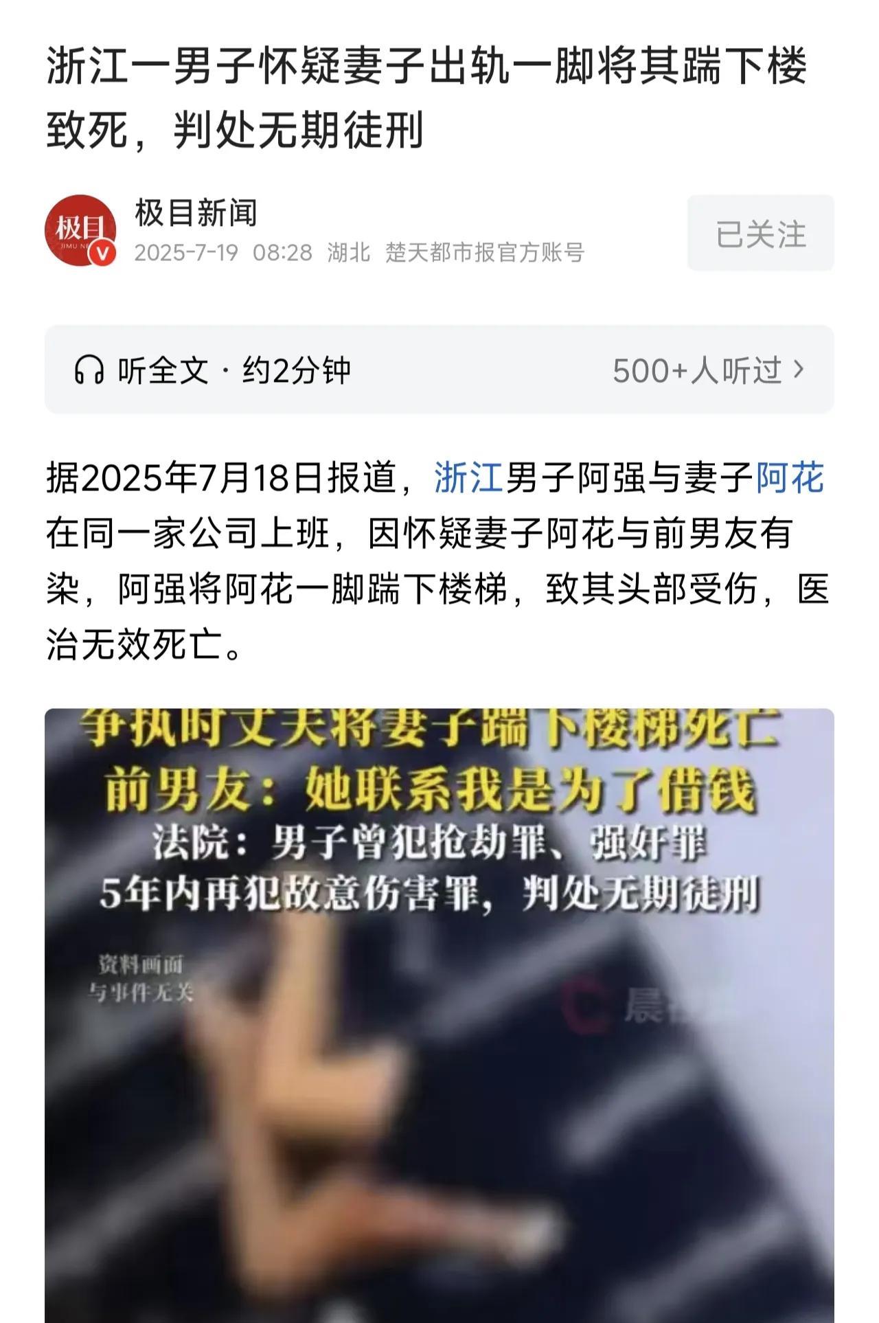 浙江,一男子发现妻子跟前男友有联系,怀疑她给自己戴了一顶绿油油的帽子,他和妻子吵架时,一脚丫子把她踹下楼梯,没想到,妻子大头着地,抢救1个多后身亡,男子的身份惊呆众人,而妻子前男友一番话,揭开真相。 7月19日,据极目新闻报道,2024年5月24日,某家公司的员工,大多数人都听到阿强骂妻子阿花“犯贱”,两个人你一句我一句,针尖对麦芒,吵的不可开交。 夫妻过日子,哪有舌头不碰牙的?所以大家并没在意,可谁都没有想到,这对夫妻争吵,竟然能吵出人命,悲剧就在一瞬间发生了。 据同事说,阿强和阿花在一家公司上班,这天,两人莫名其妙就在车间里吵了起来,而且双方不是普通的拌嘴,都剑拔弩张,越演越烈。 可能是阿花不屑跟阿强再争执下去,也可能是怕其他同事笑话,她转身准备离开车间,惹不起还躲不起吗? 没想到,阿强不依不饶,竟然跟在她身后,用手使劲推阿花脑袋一下,阿花一个趔趄,直接撞在 车间的防火门上,差点没摔倒。 阿花一看阿强动手了,按她以往的经验,他这是准备拳脚相加了,好汉不吃眼前亏,赶紧撤吧,于是,阿花准备下楼逃离。 可不料,阿强不给阿花逃之夭夭的机会,竟然抬起一只脚,对着阿花踹去。 只见阿花惨叫一声,从楼梯上连滚带爬摔了下来,应声倒地,直接晕厥过去。 阿被大家七手八脚送到医院,同事们都认为,阿花可能也就受点伤,或轻或重,不至于丢掉性命。 可抢救了1个多月后,2024年7月3日,阿花还是医治无效死亡。 阿强被抓捕归案,他却一口咬定,自己才是冤大头,据阿强交代,他无意间发现,阿花跟前男友联系。 阿强怀疑妻子给自己戴了绿帽子,心里耿耿于怀,而阿花背叛了自己,还想花他挣的钱,他发了3800元工资,她都要给拿走。 一个要,一个不给,再加上他的怀疑,所以一时没忍住,两人就在车间吵了起来。0 但阿强狡辩,阿花是在跟他争吵时,甩手离开时,一个不小心滚下楼梯的,不是他踹的。 而据阿花前男友说,他和阿花2023年8月分手了,阿花不知道什么原因,负债累累,有20多万的欠款,他倾其所有,帮着还了十几万。 也不知道,是不是前男友再没还款能力,不能帮自己堵窟窿了,阿花才离开他的,反正,她转身跟阿强结为夫妻。 但是,阿花婚后继续和前男友藕断丝连,经常跟他借钱,2024年5月,阿花又跟前男友开了口,一下子就借了9000元,还承诺20号发工资就还。 念着自己和阿花的旧情,再加上她承诺发工资就还,前男友还是抹不开面子拒绝,硬着头皮借了。 没想到,阿花到了20日,迟迟不还钱。前男友联系阿花,发现自己在她的黑名单里,前男友后悔已经来不及了,看来这钱又打水漂了。 而帽子叔叔一查,发现阿强身份可不一般,劣迹斑斑,他曾因抢 劫罪、强 奸罪两度被判刑,而他故意伤害阿花的罪行,是他在出狱的5年内发生的,是累犯。 法院最终判决阿强犯故意伤害罪,判处无期徒刑,剥夺政治权利终身。 有人说,这女的欠二十多万,前男友帮她还了十几万,可能是前男友没能力再给她还钱了又找了这个阿强,她可能认为虽然阿强犯过抢劫强奸,只要能养她帮她还钱就行,他们那天争吵也是因为阿强不给她还欠款。 还有人说,爱错人最后人财两空,辜负了爱自己的人,因果不空。 两败俱伤,女孩子找对象,千万要擦亮眼睛,平淡实在人才能有长久安全感,不要目光总往高处看,高处的风景不适合自己。 女怕嫁错郎,男怕入错行。不疼老婆,起码要尊重老婆,即使不是你老婆,也不能打人啊!应当严惩,以儆效尤! 《刑法》第234条规定:故意伤害他人身体的,处三年以下有期徒刑、拘役或者管制。犯前款罪,致人重伤的,处三年以上十年以下有期徒刑;致人死亡或者以特别残忍手段致人重伤造成严重残疾的,处十年以上有期徒刑、无期徒刑或者死刑。 阿强因怀疑妻子阿花与前男友有染,在争吵中踹其下楼导致阿花头部受伤、抢救无效死亡,主观上具有伤害故意,客观上直接实施了致人死亡的行为,符合故意伤害罪的主客观要件。 尽管阿强辩称妻子是“自己摔下楼梯”,但法院根据目击者证言和现场证据,如阿强踹人动作、暴 力推搡行为,认定其行为与阿花死亡存在直接因果关系。 阿强曾因抢 劫罪、强 奸罪两次被判刑,刑满释放后五年内再犯故意伤害罪,根据《刑法》第65条构成累犯,依法应从重处罚。 阿强因情感纠纷直接实施暴 力,造成阿花死亡,属于“致人死亡”的加重结果。 虽然法院最终认定为故意伤害罪而非故意杀人罪,可能因缺乏明确杀人故意,但结合其累犯情节,判处无期徒刑符合罪刑相适应原则。 阿花前男友称二人仅为债务联系,无情感纠葛,但该情节不影响对阿强主观伤害故意的认定。即使阿花存在借款纠纷,阿强无权以暴力手段“解决问题”。 任何情感纠纷或矛盾均需通过合法途径解决,暴力行为将面临严惩。 对此,你怎么看?