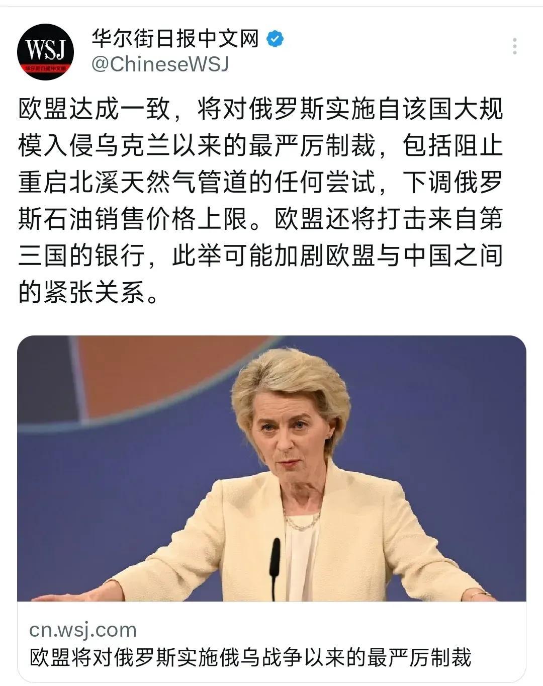 《华尔街日报》中文网7月19日报道:“欧盟达成一致,将对俄罗斯实施自该国大规模入