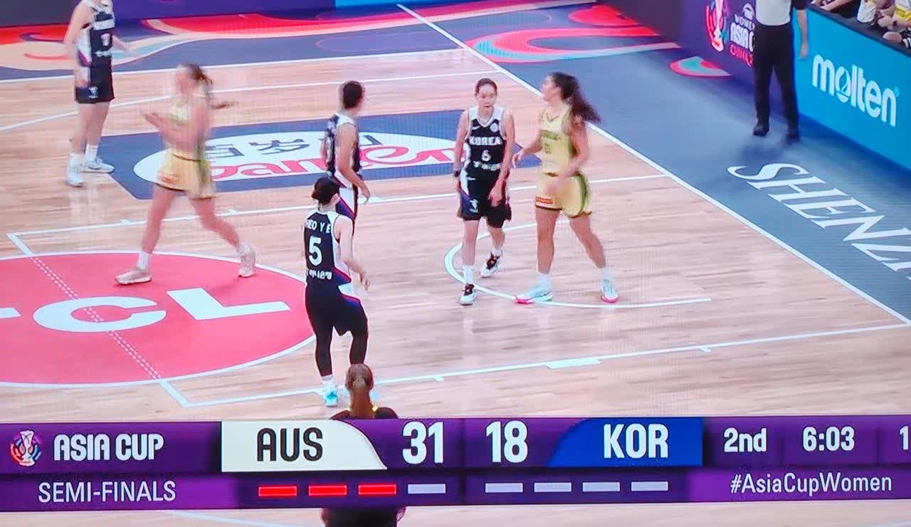 澳大利亚同韩国队半决赛第二节开始。第一节韩国队以13::22落后。第二节开始,韩国队先得3 分。澳大利亚马上还以颜色,连续投中两个3分。28:16,澳大利亚领先。韩国队叫了暂停。韩国队将比分追到30:33,还落后3分。韩国队找到了自了的节奏,32:33韩国队只落后1分。韩国又投中3分,35:33,韩国队比分反超。35平。37:35,澳大利亚反超。第二节结束,澳大利亚以42:38领先韩国队。上半场结束。澳大利亚42:38领先。