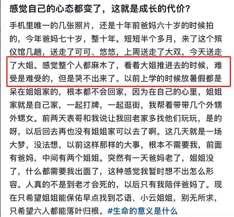 -阿坝坠河的大明玉在四川火化了,弟弟明鑫说:“推她进火化炉时,一滴泪也没有,已经麻木了,因为这是我第4次送她们了。” 本来他们姐妹三个是想趁着孩子暑假,一起外出旅游一下,让孩子见识一下外面的世界。 但没想到生命却留在了四川阿坝州,一场意外,让她们失去了生命。 明玉和明彩两个是亲姐妹,当她们和孩子的遗体被找到后,最悲伤的便是他们的弟弟明鑫。 他们本就是姐弟三个,平时感情都特别好,明鑫是最小的弟弟,这次两个姐姐外出游玩,他因为刚当父亲不久,所以在家里陪伴孩子。 在他得知意外发生的时候,第一时间并不相信这是事实,因为他大姐和二姐一直是他最爱的家人。 但随着遗体慢慢被找到,他的情绪一次又一次的崩溃,外甥女的遗体和姐姐的遗体先后被找到,当他送别自己姐姐明玉的时候,他表示自己一滴眼泪都没流,整个人已经麻木了。 他对未来感到恐惧和害怕,没有姐姐的庇佑,他不敢想自己的生活会变的多么糟糕。 原来他们的父母已经70岁了,平时家里的事情两个姐姐都比较操心,他对姐姐的爱一直都很多。 姐姐家的孩子对他来讲就如同自己亲生的一样,因为当时的他没有结婚,经常将姐姐家两个孩子带在身边。 这次他送走了自己最爱的人,对于意外的来临他没有预料到,而他也深知,自己身上背负多大的责任。 父母已经年迈,孩子尚在襁褓之中,他不能让自己倒下,这次意外夺走了他的家人,他只希望能尽快找到自己的表姐和孩子,让她们也早日入土为安。