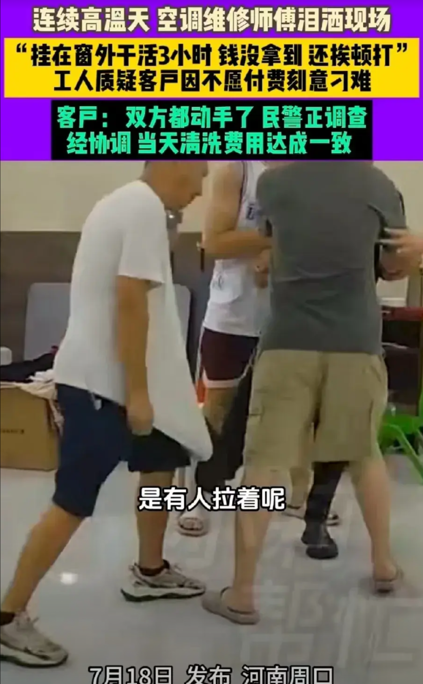 河南周口,酒店负责人反映空调不制冷,经过检查是外机太脏,需要清洗,150元一台。刚开始负责人要求免费清洗,后来酒店另一位女工作人员说愿意花钱洗。维修工上门后,挂在室外,顶着高温,连续工作三小时,清洗了6台空调,谁知刚洗完,酒店负责人就冲过来骂爹骂娘,不但不给钱,还踹了师傅一脚。师傅倍感委屈,潸然泪下。