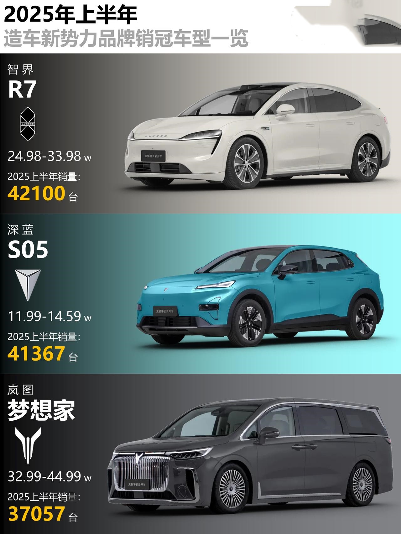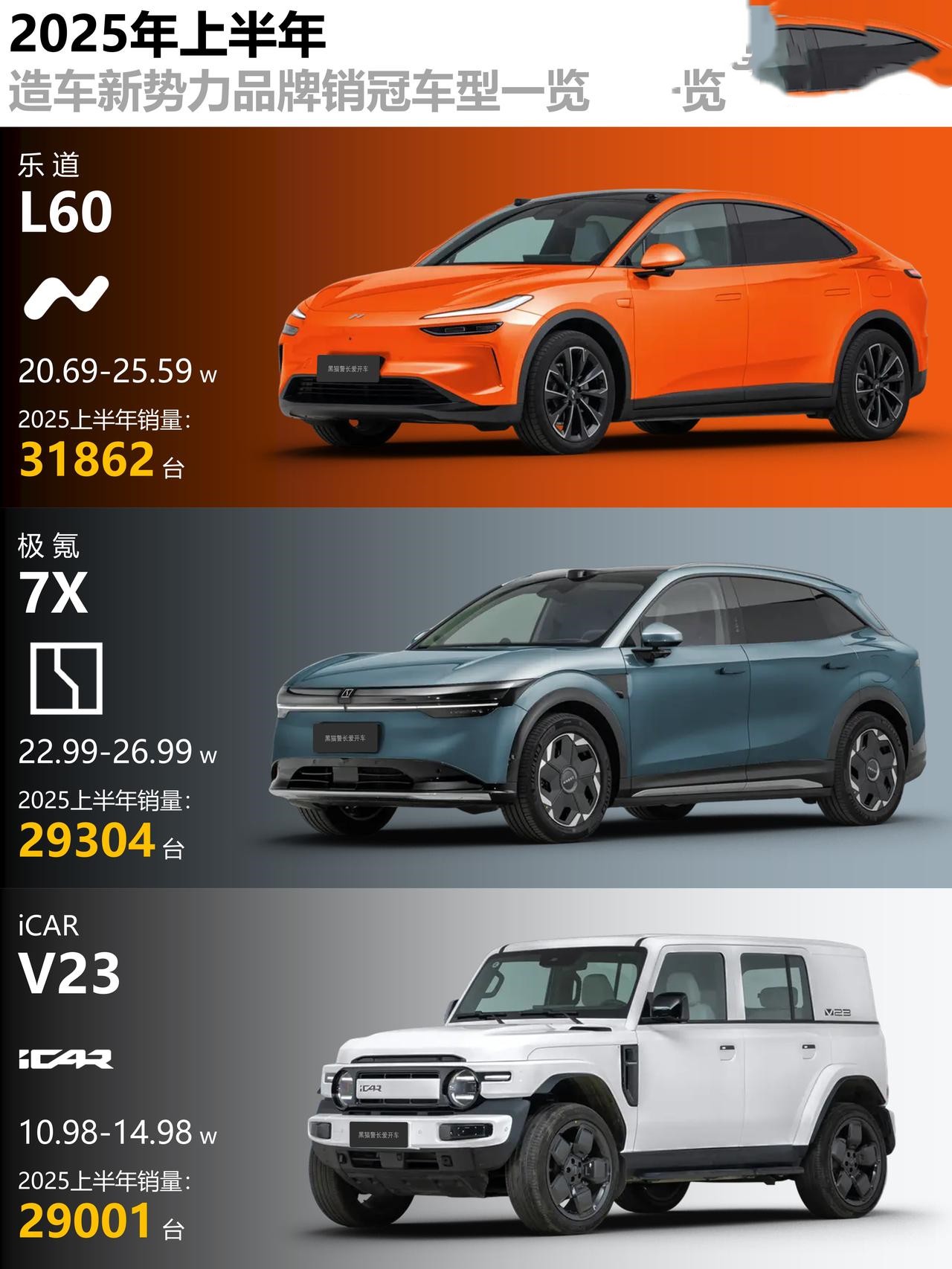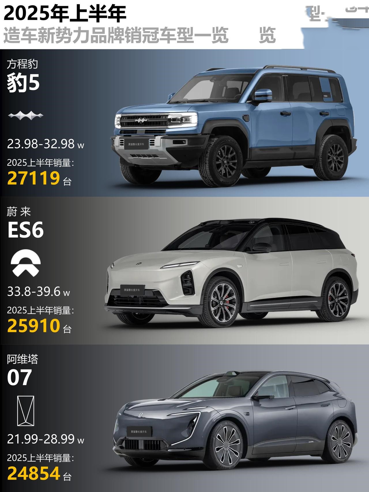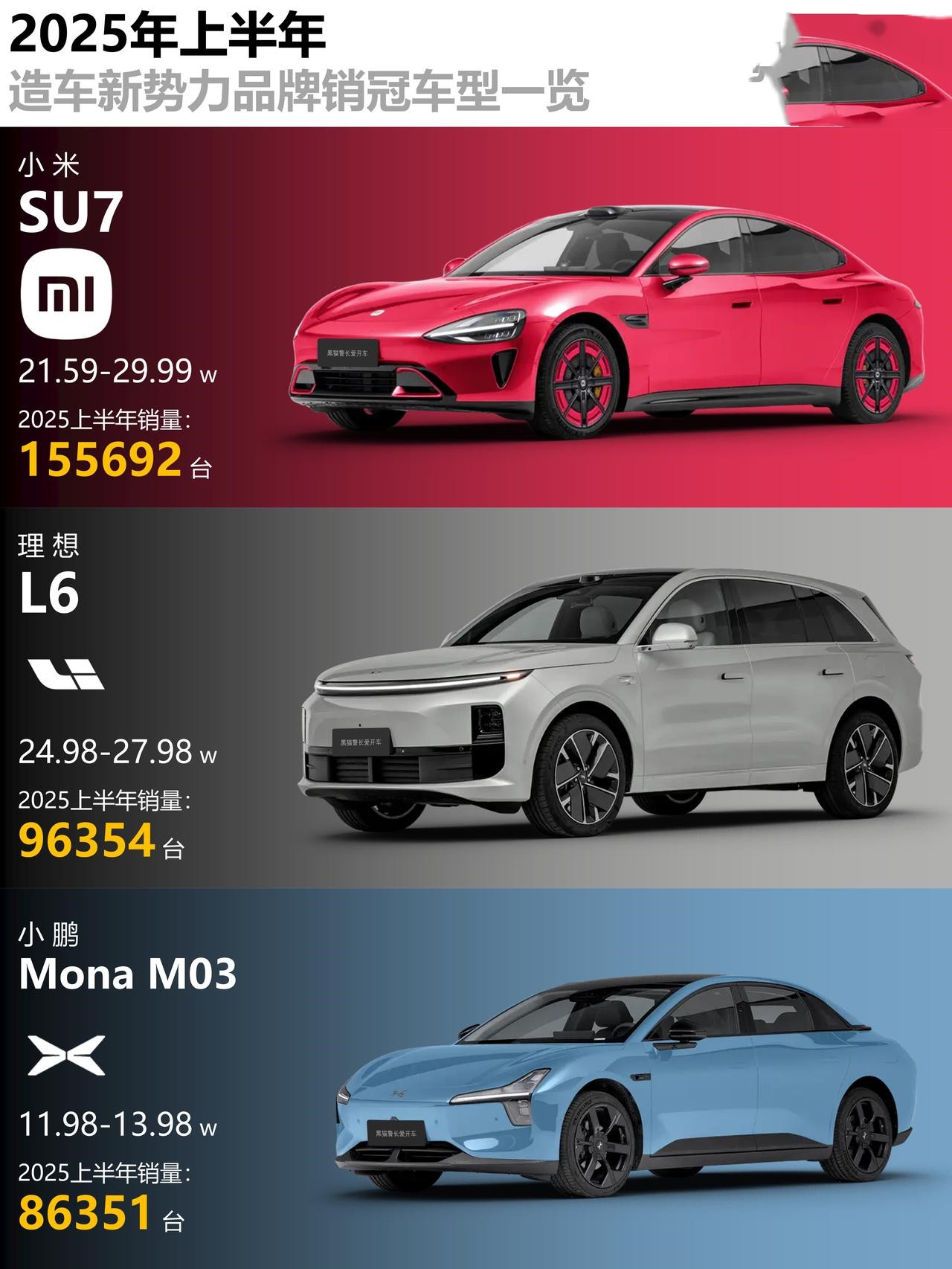 1⃣️小米SU7:当红炸子鸡💥,上半年流量最大的车没有之一,工厂干冒烟了还要排队大半年,估计提前预定2025年新势力销冠车型🏆 2⃣️理想L6:理想增程系产品出一个🔥一个,但代价就是越出越便宜,L6目前在增程产品中依然强势,但理想已经不可避免的开始探索纯电产品序列 3⃣️小鹏Mona M03:小鹏涅槃之作,足够便宜的价格,年轻时尚的外观,好用的辅助驾驶能力,还不错的空间舒适度表现都是成功的理由,这辆车上有太多成功经验值得新势力们学习 4⃣️问界M9:榜单中最贵的车型,50万以上绝对王者,卖一台顶别家2/3/4台,属实bug 5⃣️零跑C10:上半年新势力总销量第一的品牌,旗下车型几乎各个能打,C10是其中最能打的,极致性价比 6⃣️腾势D9:观察下你周围有多少公司商务车换成这个了❓