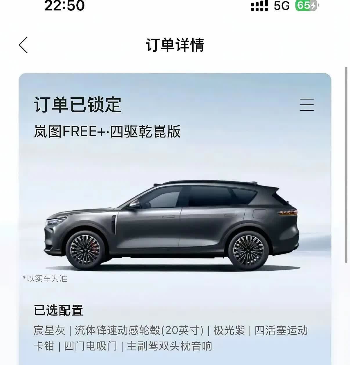 请大家记住:买车,如果有可能,一定要买四驱的! 我买的岚图Free+,就坚决选的四驱,虽然多出了三万,但感觉超值。 二十万出头,而且这个配置带乾崑智驾4.0,绝对的满意! 静等提车。