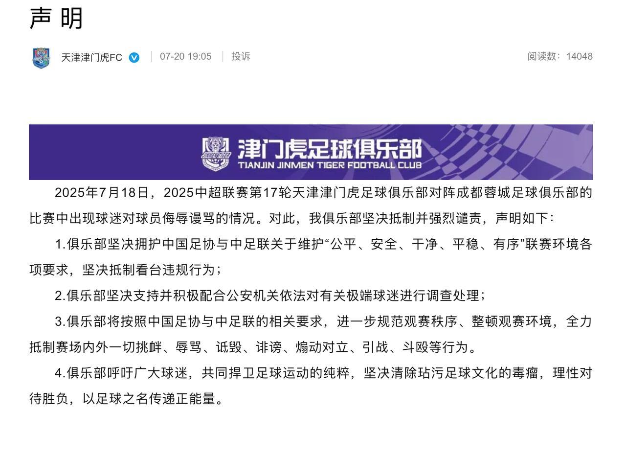 天津津门虎官方声明:坚决抵制并强烈谴责球迷侮辱谩骂球员的行为 声明表示,俱乐部会