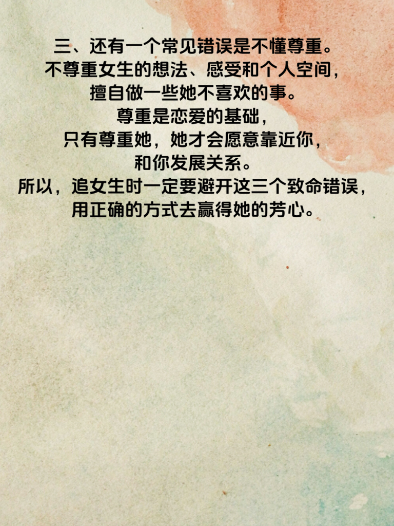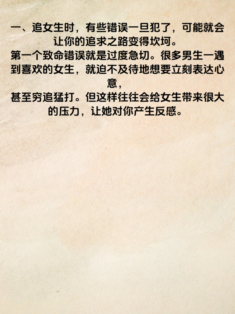 一、追女生时,有些错误一旦犯了,可能就会让你的追求之路变得坎坷。第一个致命错误就是过度急切。很多男生一遇到喜欢的女生,就迫不及待地想要立刻表达心意,甚至穷追猛打。但这样往往会给女生带来很大的压力,让她对你产生反感。 二、第二个错误是缺乏真诚。为了吸引女生注意,编造一些虚假的经历或者伪装自己。可纸包不住火,一旦被发现,之前所有的努力都可能付诸东流。真诚才是打动人心的关键,展现真实的自己,哪怕有缺点,也会让女生觉得你可靠。 三、还有一个常见错误是不懂尊重。不尊重女生的想法、感受和个人空间,擅自做一些她不喜欢的事。尊重是恋爱的基础,只有尊重她,她才会愿意靠近你,和你发展关系。所以,追女生时一定要避开这三个致命错误,用正确的方式去赢得她的芳心。