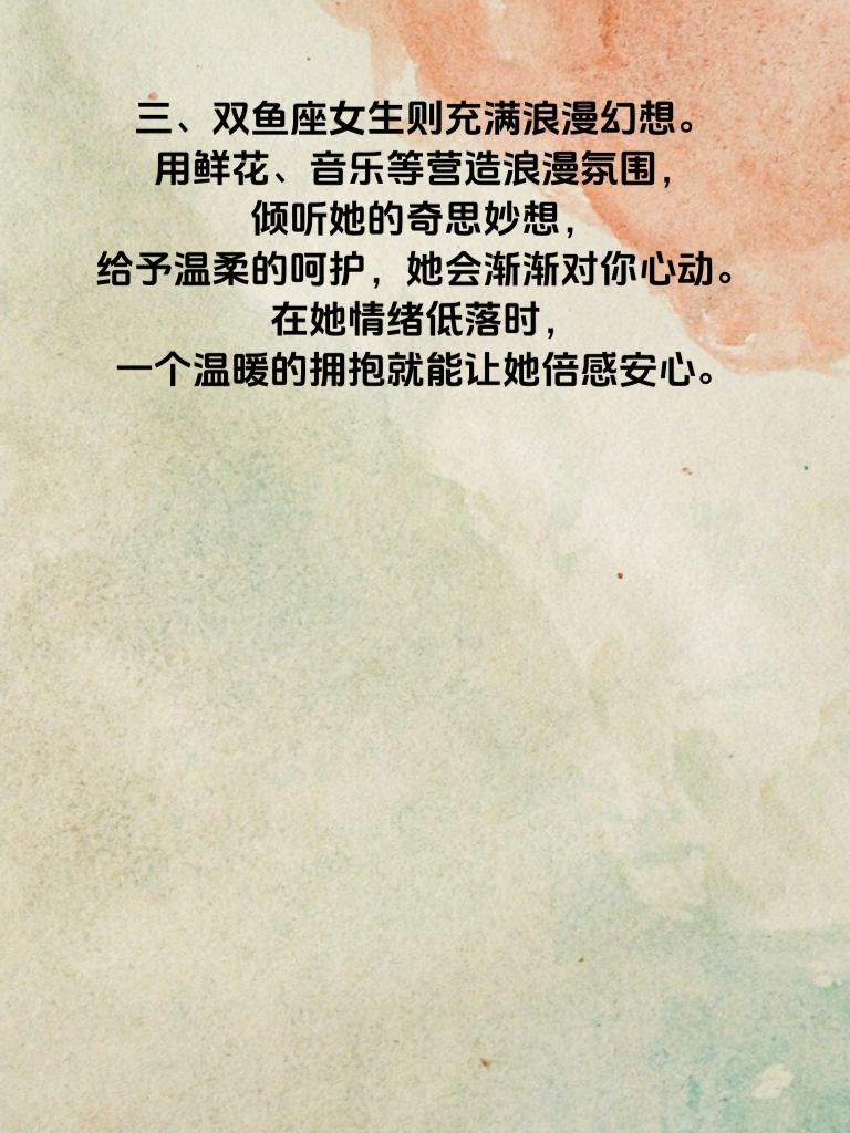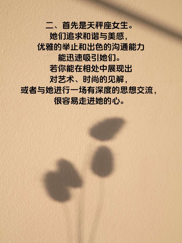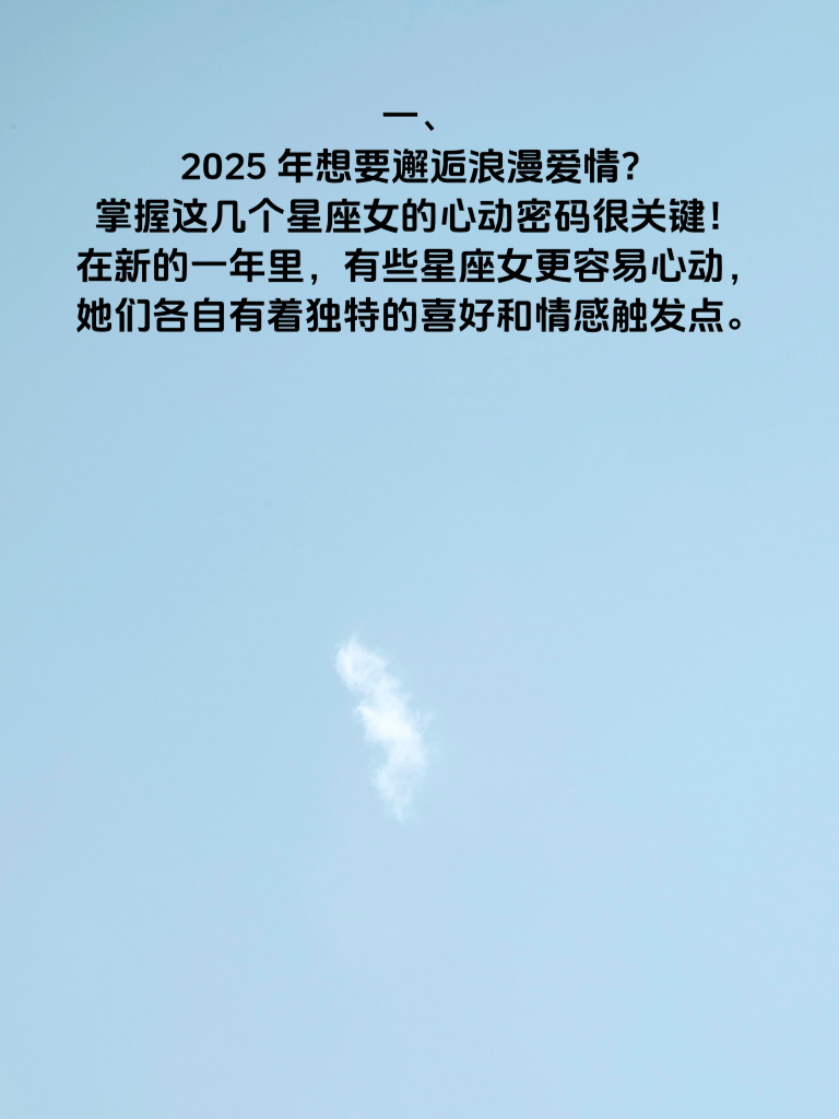 一、2025 年想要邂逅浪漫爱情?掌握这几个星座女的心动密码很关键!在新的一年里,有些星座女更容易心动,她们各自有着独特的喜好和情感触发点。 二、首先是天秤座女生。她们追求和谐与美感,优雅的举止和出色的沟通能力能迅速吸引她们。若你能在相处中展现出对艺术、时尚的见解,或者与她进行一场有深度的思想交流,很容易走进她的心。 三、双鱼座女生则充满浪漫幻想。用鲜花、音乐等营造浪漫氛围,倾听她的奇思妙想,给予温柔的呵护,她会渐渐对你心动。在她情绪低落时,一个温暖的拥抱就能让她倍感安心。 四、白羊座女生热情直爽,喜欢有活力、勇敢的人。当你在她面前展现出积极进取的一面,陪她一起挑战新事物,如冒险运动等,她会被你的热情感染,从而心动。 五、抓住这些星座女的特点,在 2025 年开启属于你的浪漫桃花之旅,让爱情之花绚烂绽放。