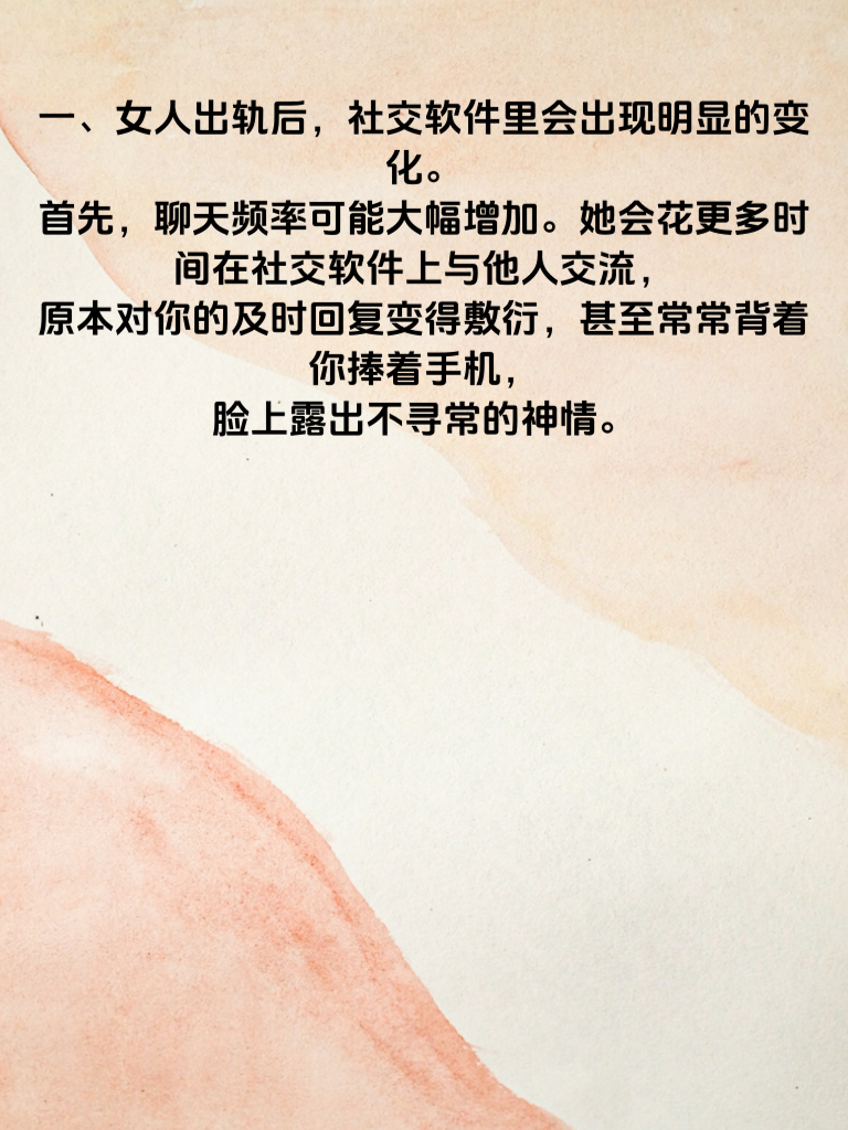 一、女人出轨后,社交软件里会出现明显的变化。首先,聊天频率可能大幅增加。她会花更多时间在社交软件上与他人交流,原本对你的及时回复变得敷衍,甚至常常背着你捧着手机,脸上露出不寻常的神情。 二、其次,社交动态也会改变。曾经那些只与你分享的生活点滴,现在可能开始频繁展示给其他人。她会精心挑选照片发布,配上意味深长的文字,试图吸引特定人的关注。 三、再者,对社交软件的使用习惯也有了新变化。她可能开始格外注重隐私设置,以前对你毫无保留的手机,现在会经常背着你操作。甚至在你靠近时,会迅速切换页面或锁屏,眼神中透露出紧张。