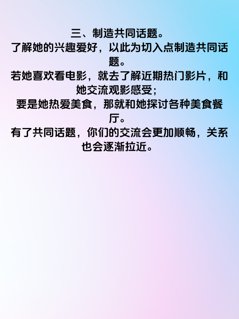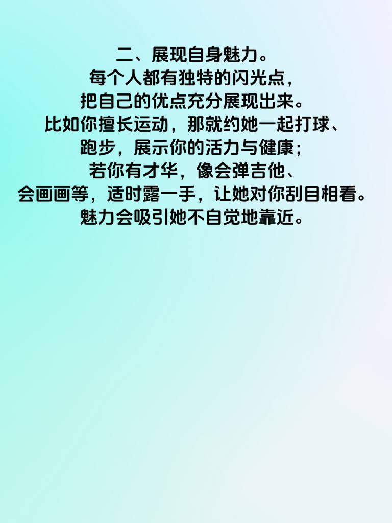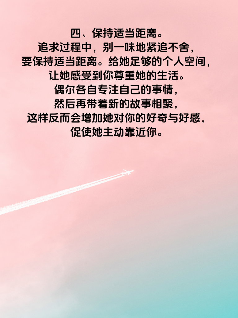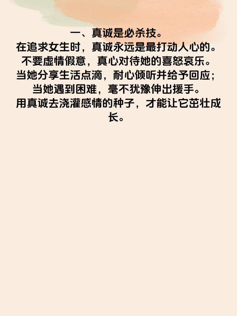一、真诚是必杀技。在追求女生时,真诚永远是最打动人心的。不要虚情假意,真心对待她的喜怒哀乐。当她分享生活点滴,耐心倾听并给予回应;当她遇到困难,毫不犹豫伸出援手。用真诚去浇灌感情的种子,才能让它茁壮成长。 二、展现自身魅力。每个人都有独特的闪光点,把自己的优点充分展现出来。比如你擅长运动,那就约她一起打球、跑步,展示你的活力与健康;若你有才华,像会弹吉他、会画画等,适时露一手,让她对你刮目相看。魅力会吸引她不自觉地靠近。 三、制造共同话题。了解她的兴趣爱好,以此为切入点制造共同话题。若她喜欢看电影,就去了解近期热门影片,和她交流观影感受;要是她热爱美食,那就和她探讨各种美食餐厅。有了共同话题,你们的交流会更加顺畅,关系也会逐渐拉近。 四、保持适当距离。追求过程中,别一味地紧追不舍,要保持适当距离。给她足够的个人空间,让她感受到你尊重她的生活。偶尔各自专注自己的事情,然后再带着新的故事相聚,这样反而会增加她对你的好奇与好感,促使她主动靠近你。