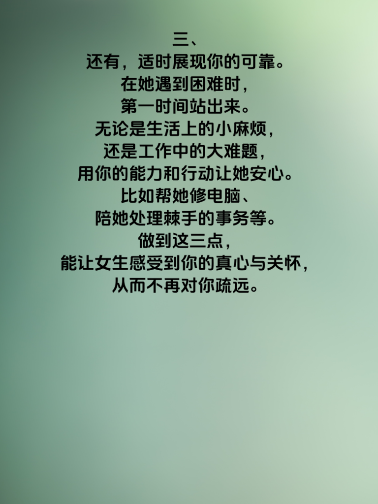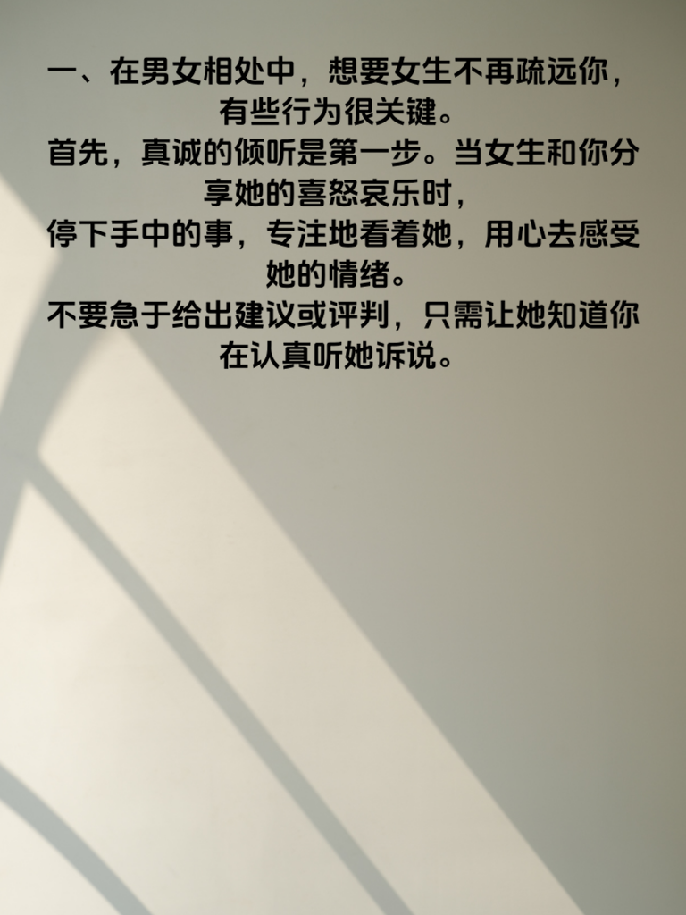 一、在男女相处中,想要女生不再疏远你,有些行为很关键。首先,真诚的倾听是第一步。当女生和你分享她的喜怒哀乐时,停下手中的事,专注地看着她,用心去感受她的情绪。不要急于给出建议或评判,只需让她知道你在认真听她诉说。 二、尊重她的个人空间也极为重要。每个人都需要有自己独处和与朋友相处的时间。不要过度纠缠,给她足够的自由去做自己喜欢的事。比如她想去参加闺蜜聚会,大方支持,而不是抱怨她没时间陪你。 三、还有,适时展现你的可靠。在她遇到困难时,第一时间站出来。无论是生活上的小麻烦,还是工作中的大难题,用你的能力和行动让她安心。比如帮她修电脑、陪她处理棘手的事务等。做到这三点,能让女生感受到你的真心与关怀,从而不再对你疏远。