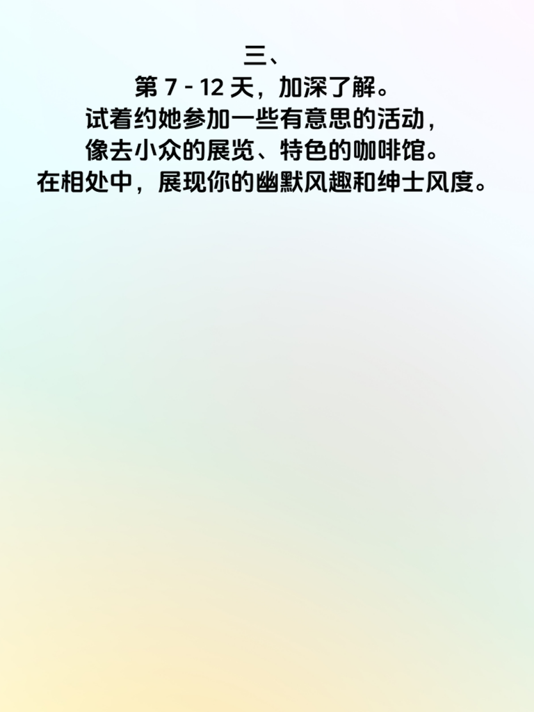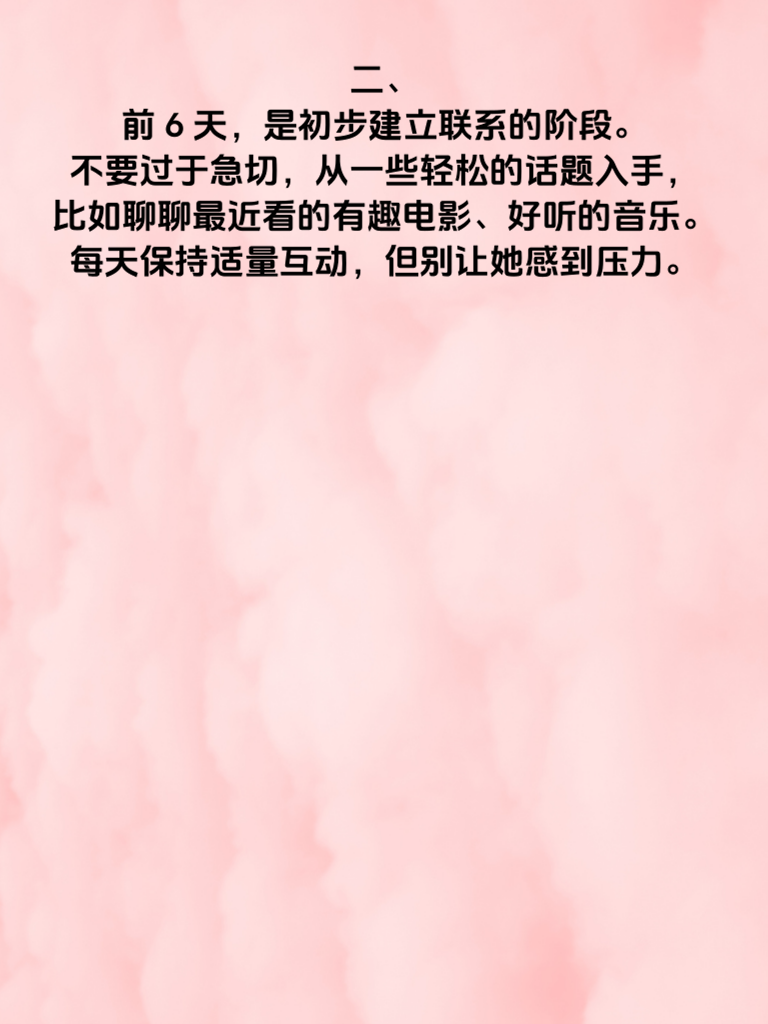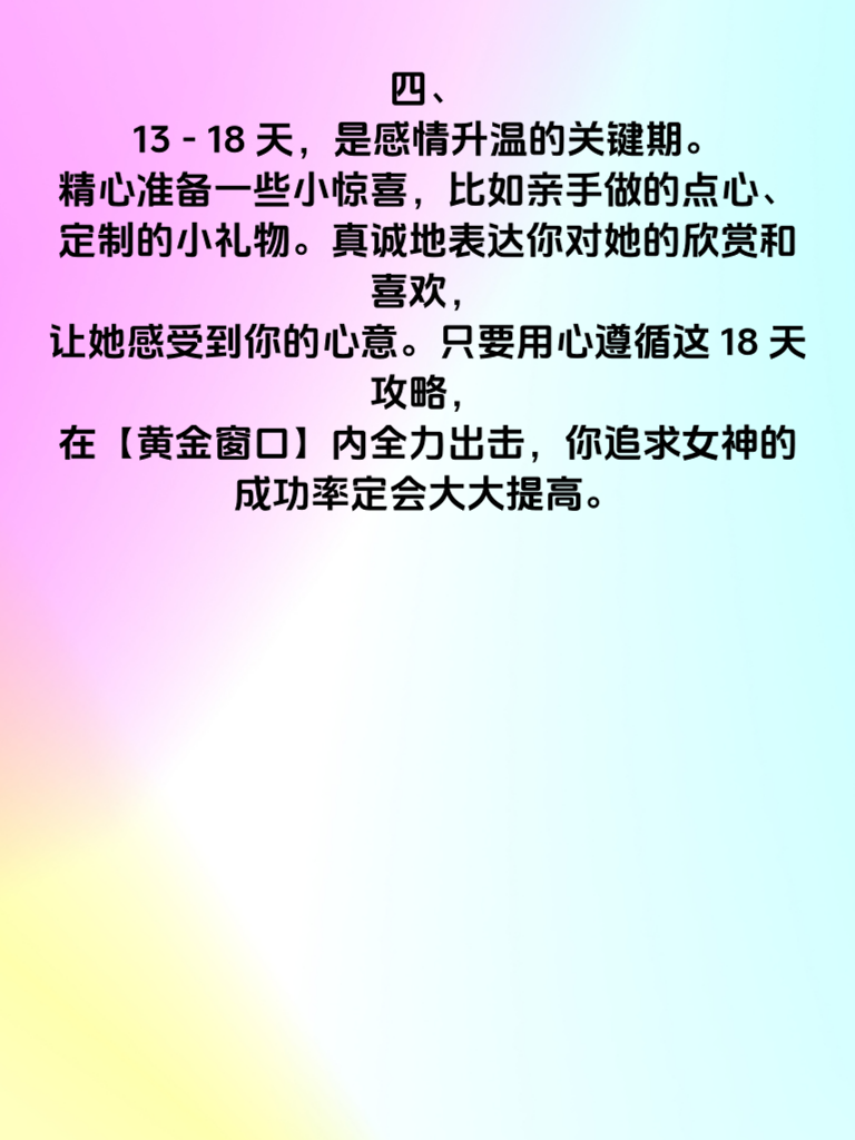 一、在追求女神的道路上,有个关键的【黄金窗口】时期,把握好它,能让你的追求事半功倍。这18天高效攻略,助你成功抱得美人归。 二、前6天,是初步建立联系的阶段。不要过于急切,从一些轻松的话题入手,比如聊聊最近看的有趣电影、好听的音乐。每天保持适量互动,但别让她感到压力。 三、第7 - 12天,加深了解。试着约她参加一些有意思的活动,像去小众的展览、特色的咖啡馆。在相处中,展现你的幽默风趣和绅士风度。 四、13 - 18天,是感情升温的关键期。精心准备一些小惊喜,比如亲手做的点心、定制的小礼物。真诚地表达你对她的欣赏和喜欢,让她感受到你的心意。只要用心遵循这18天攻略,在【黄金窗口】内全力出击,你追求女神的成功率定会大大提高。