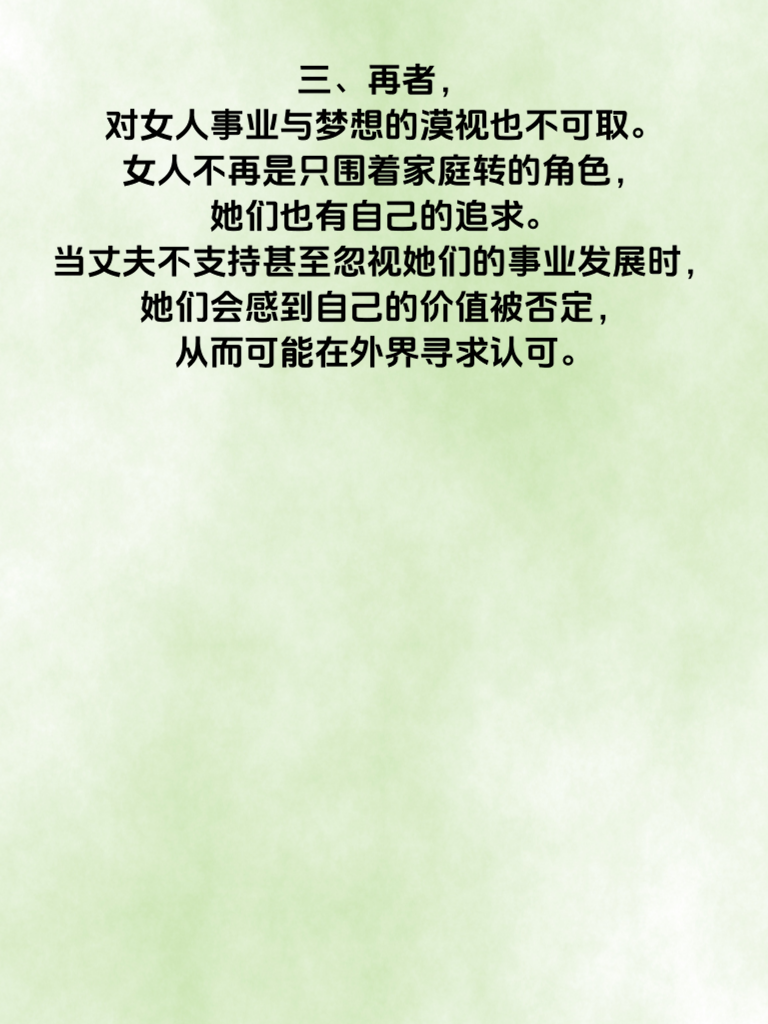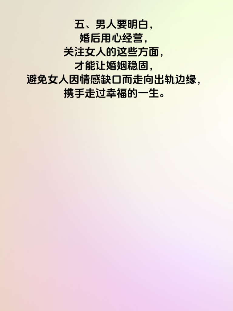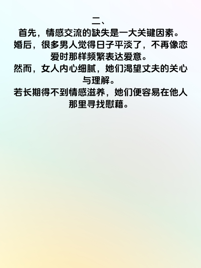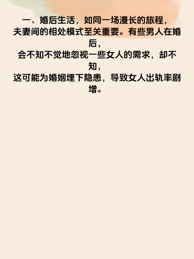 一、婚后生活,如同一场漫长的旅程,夫妻间的相处模式至关重要。有些男人在婚后,会不知不觉地忽视一些女人的需求,却不知,这可能为婚姻埋下隐患,导致女人出轨率剧增。 二、首先,情感交流的缺失是一大关键因素。婚后,很多男人觉得日子平淡了,不再像恋爱时那样频繁表达爱意。然而,女人内心细腻,她们渴望丈夫的关心与理解。若长期得不到情感滋养,她们便容易在他人那里寻找慰藉。 三、再者,对女人事业与梦想的漠视也不可取。女人不再是只围着家庭转的角色,她们也有自己的追求。当丈夫不支持甚至忽视她们的事业发展时,她们会感到自己的价值被否定,从而可能在外界寻求认可。 四、另外,生活细节上的忽略也不容忽视。比如生日、纪念日等特殊日子,男人若忘记,会让女人心生失落。平日里对她的喜好、情绪变化不管不顾,也会让她觉得自己不被重视。 五、男人要明白,婚后用心经营,关注女人的这些方面,才能让婚姻稳固,避免女人因情感缺口而走向出轨边缘,携手走过幸福的一生。