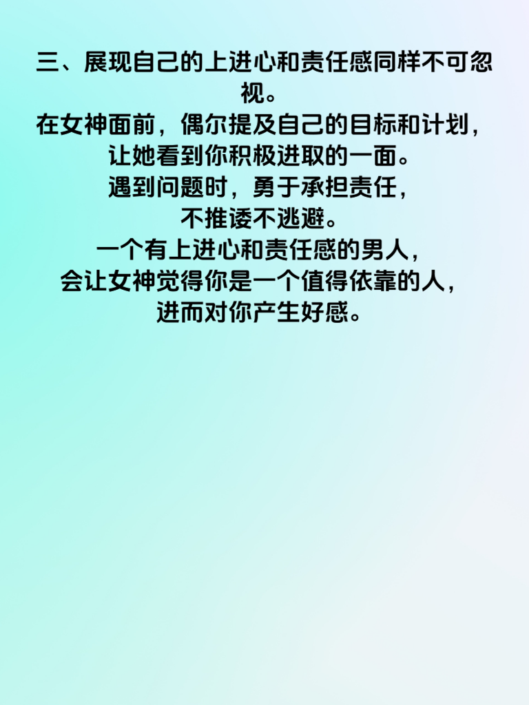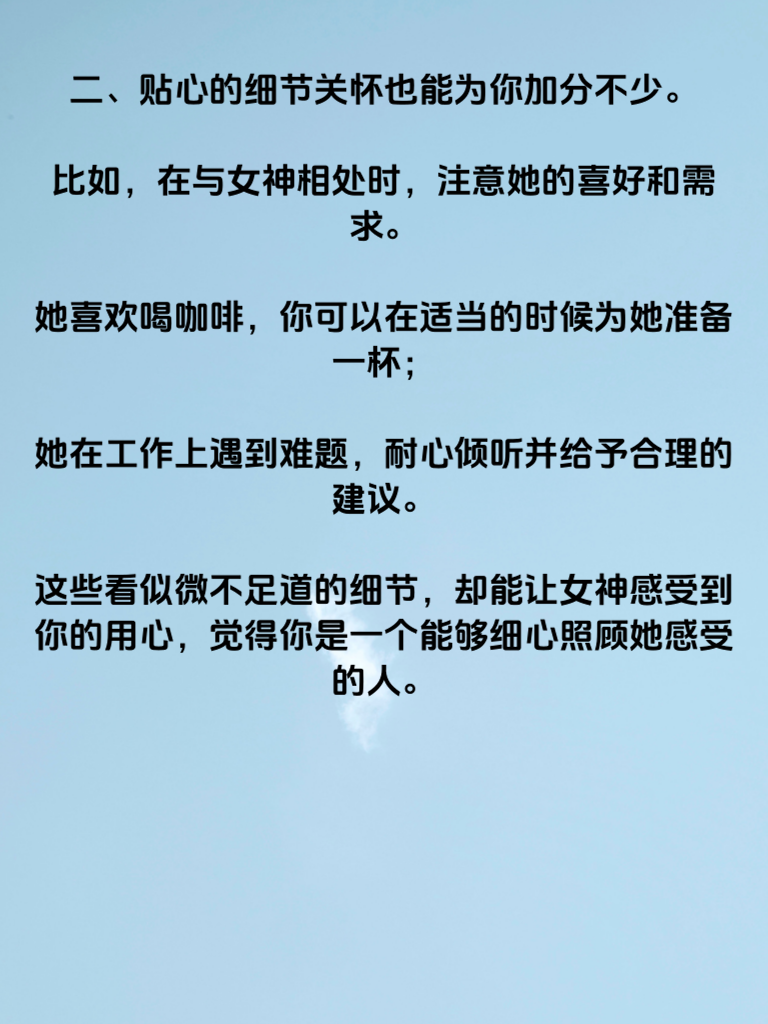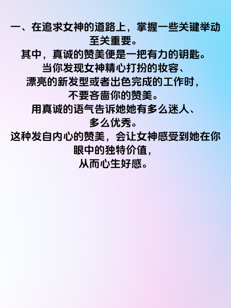 一、在追求女神的道路上,掌握一些关键举动至关重要。其中,真诚的赞美便是一把有力的钥匙。当你发现女神精心打扮的妆容、漂亮的新发型或者出色完成的工作时,不要吝啬你的赞美。用真诚的语气告诉她她有多么迷人、多么优秀。这种发自内心的赞美,会让女神感受到她在你眼中的独特价值,从而心生好感。 二、贴心的细节关怀也能为你加分不少。比如,在与女神相处时,注意她的喜好和需求。她喜欢喝咖啡,你可以在适当的时候为她准备一杯;她在工作上遇到难题,耐心倾听并给予合理的建议。这些看似微不足道的细节,却能让女神感受到你的用心,觉得你是一个能够细心照顾她感受的人。 三、展现自己的上进心和责任感同样不可忽视。在女神面前,偶尔提及自己的目标和计划,让她看到你积极进取的一面。遇到问题时,勇于承担责任,不推诿不逃避。一个有上进心和责任感的男人,会让女神觉得你是一个值得依靠的人,进而对你产生好感。