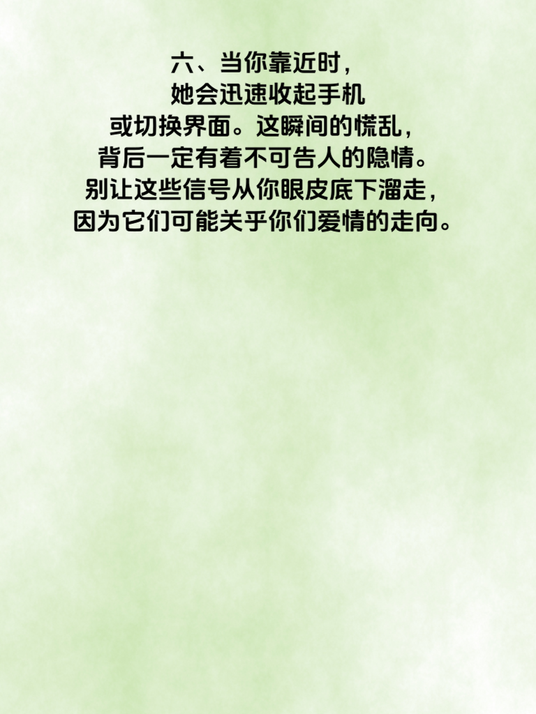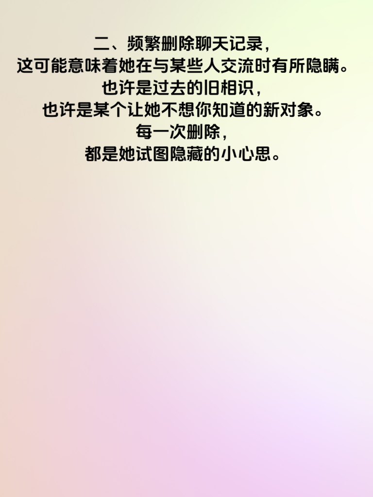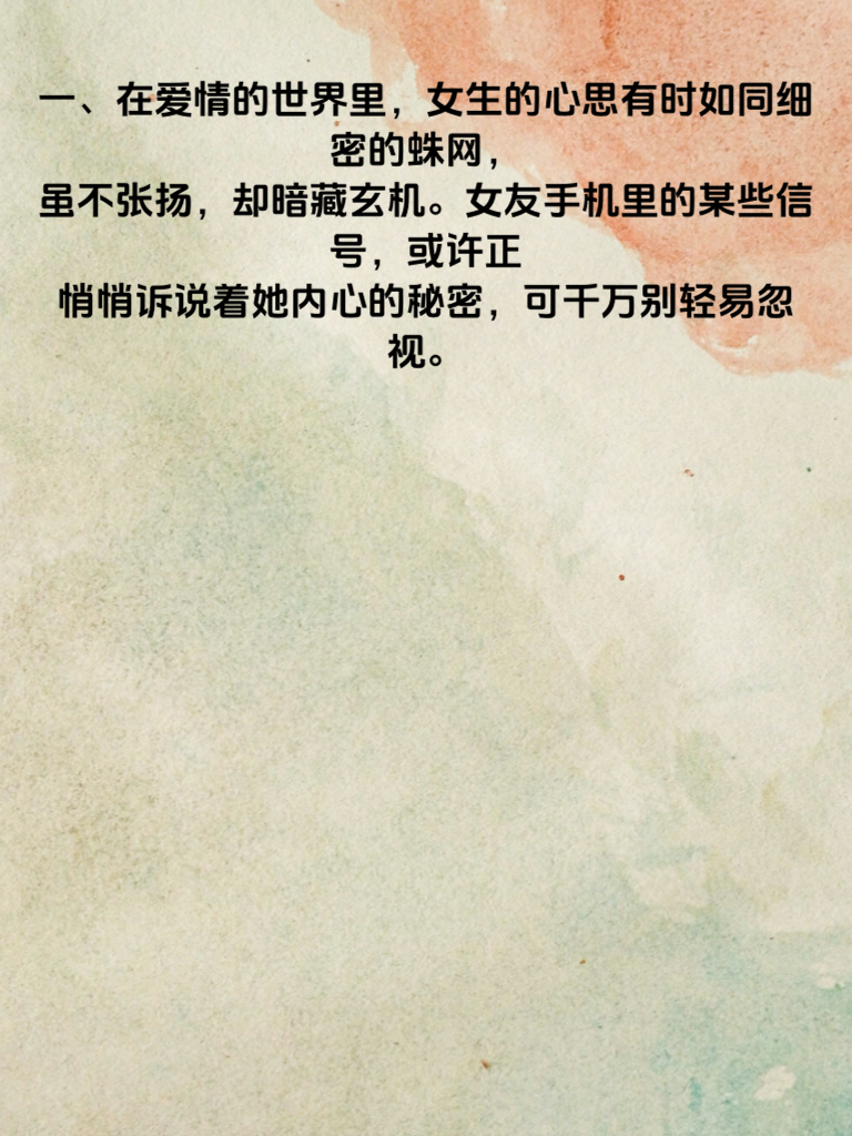 一、在爱情的世界里,女生的心思有时如同细密的蛛网,虽不张扬,却暗藏玄机。女友手机里的某些信号,或许正悄悄诉说着她内心的秘密,可千万别轻易忽视。 二、频繁删除聊天记录,这可能意味着她在与某些人交流时有所隐瞒。也许是过去的旧相识,也许是某个让她不想你知道的新对象。每一次删除,都是她试图隐藏的小心思。 三、手机不离身,甚至洗澡、睡觉时都紧紧握着。这可能不仅仅是一种习惯,更有可能是她在守护着手机里的某个秘密。那里或许有她珍视的聊天对象,或是不想被你发现的动态。 四、接电话时总是避开你,声音还刻意放低。那电话那头的人,极有可能是她不想让你知晓的存在。她的紧张与躲闪,都在透露着不寻常的信号。 五、对手机密码严防死守,一改往日对你的信任。这表明她的手机里有了需要刻意保护的内容。密码如同一把锁,锁住了她内心深处的某些情感或秘密。 六、当你靠近时,她会迅速收起手机或切换界面。这瞬间的慌乱,背后一定有着不可告人的隐情。别让这些信号从你眼皮底下溜走,因为它们可能关乎你们爱情的走向。