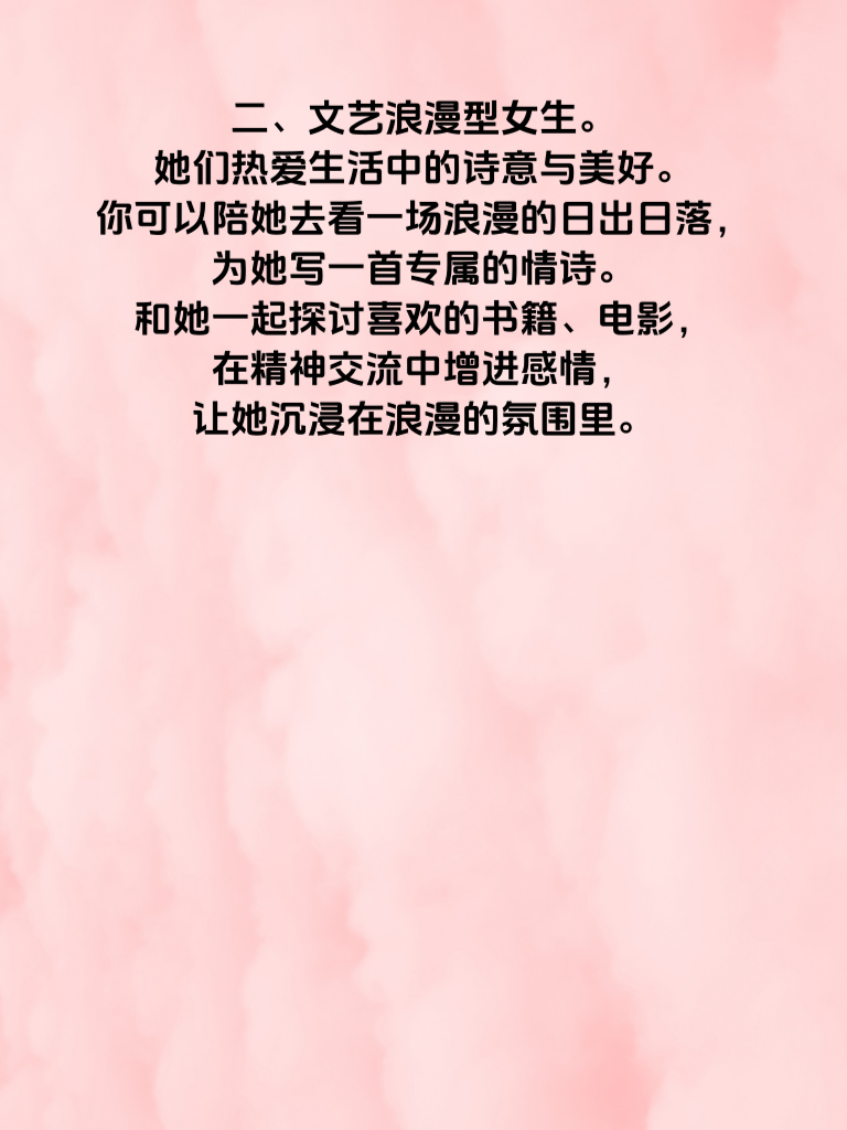 一、温柔体贴型女生。这类女生内心柔软,渴望被呵护。追求她们时,要时刻展现你的温柔。比如,在她生病时贴心照顾,天凉时提醒她添衣。用细腻的关怀温暖她的心,让她感受到你的爱意与在乎。 二、文艺浪漫型女生。她们热爱生活中的诗意与美好。你可以陪她去看一场浪漫的日出日落,为她写一首专属的情诗。和她一起探讨喜欢的书籍、电影,在精神交流中增进感情,让她沉浸在浪漫的氛围里。 三、独立自信型女生。她们欣赏有能力、有主见的男生。所以你要努力提升自己,展现你的才华与智慧。在相处中,尊重她的想法和决定,与她并肩前行,共同面对生活的挑战,让她看到你的可靠与优秀。 四、乐观开朗型女生。她们的世界充满阳光。用你的幽默风趣感染她,一起制造无数欢乐的回忆。在她遇到困难时,给予积极的鼓励,让她始终保持乐观的心态,她会很容易被你的活力所吸引。