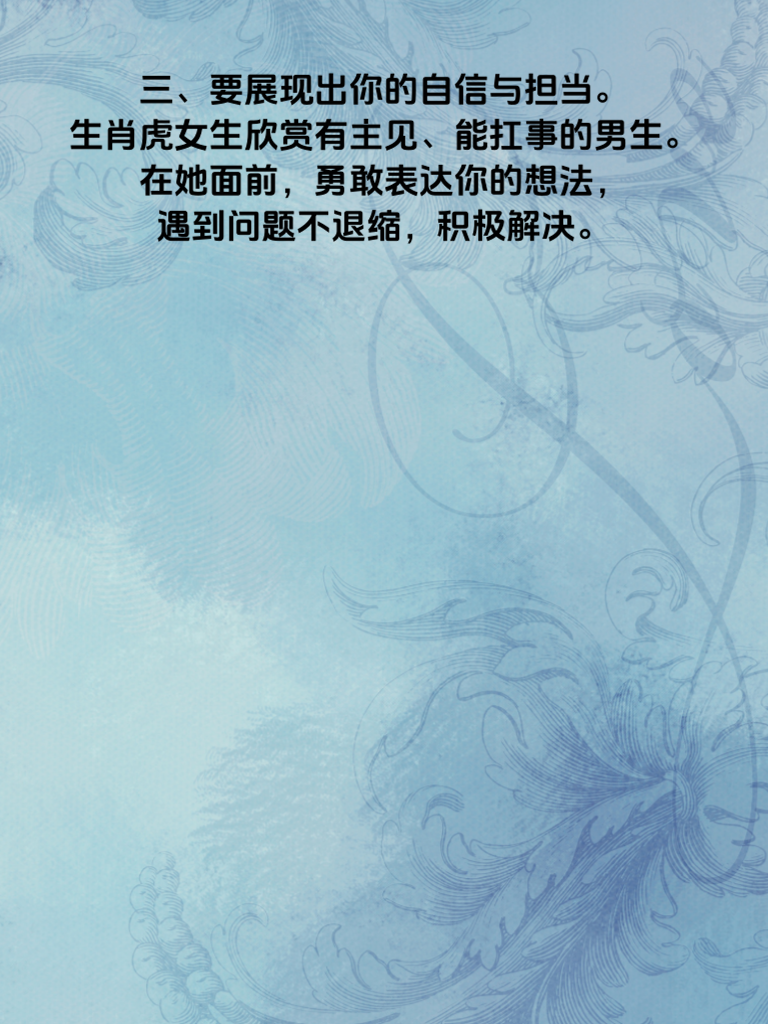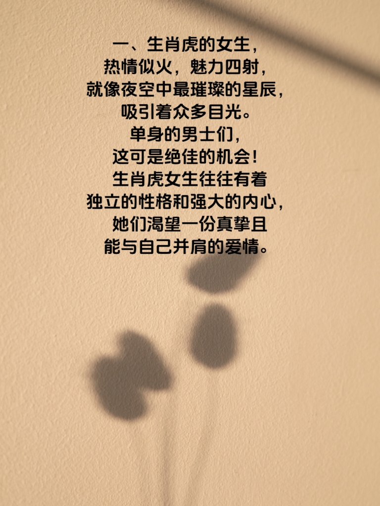 一、生肖虎的女生,热情似火,魅力四射,就像夜空中最璀璨的星辰,吸引着众多目光。单身的男士们,这可是绝佳的机会!生肖虎女生往往有着独立的性格和强大的内心,她们渴望一份真挚且能与自己并肩的爱情。 二、追求生肖虎女生,真诚是首要秘诀。别玩虚的,实实在在地展现你的真心。她们能敏锐察觉虚假,唯有真诚才能打动她们。 三、要展现出你的自信与担当。生肖虎女生欣赏有主见、能扛事的男生。在她面前,勇敢表达你的想法,遇到问题不退缩,积极解决。 四、不妨偶尔制造些小惊喜。带她去看一场浪漫的日出日落,送她一束她心仪的鲜花。小惊喜能让她感受到你的用心,让感情升温。 五、生肖虎桃花正旺,单身男们赶快行动起来吧!用对方法,抓住机会,说不定就能收获与生肖虎女生的美好爱情,开启甜蜜生活篇章。
