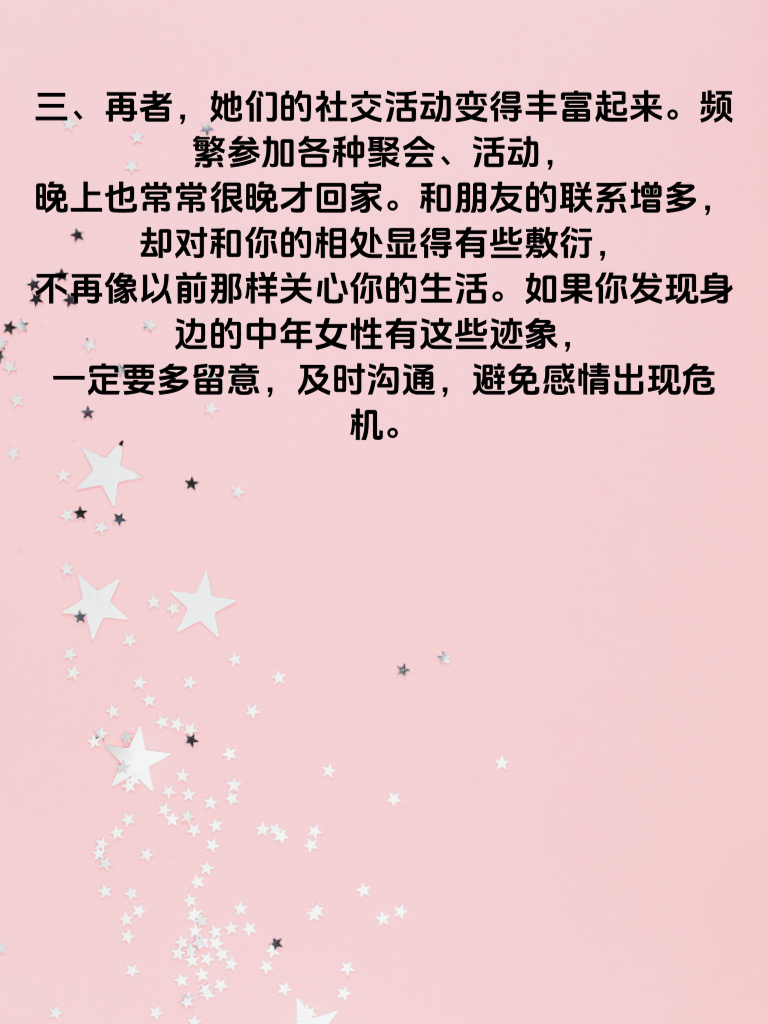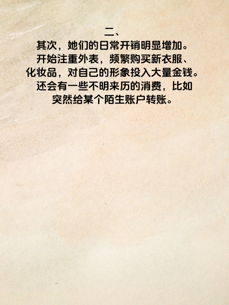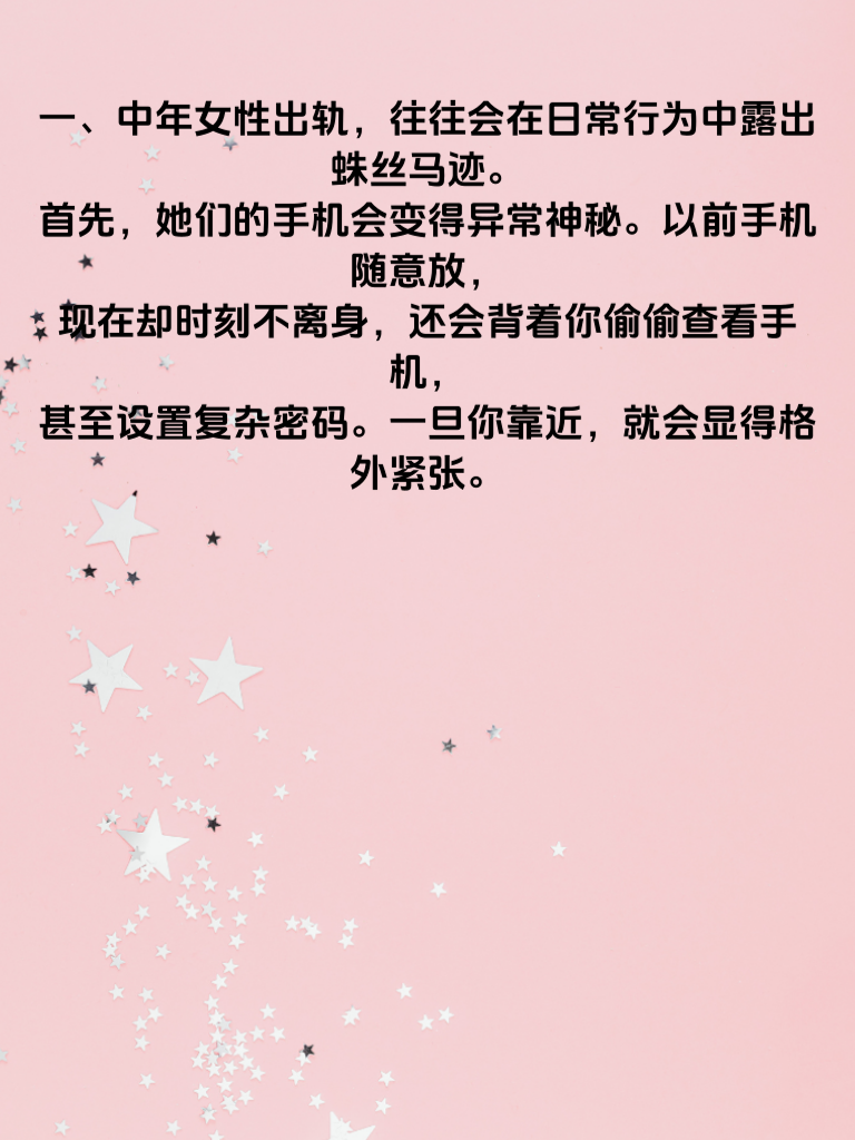 一、中年女性出轨,往往会在日常行为中露出蛛丝马迹。首先,她们的手机会变得异常神秘。以前手机随意放,现在却时刻不离身,还会背着你偷偷查看手机,甚至设置复杂密码。一旦你靠近,就会显得格外紧张。 二、其次,她们的日常开销明显增加。开始注重外表,频繁购买新衣服、化妆品,对自己的形象投入大量金钱。还会有一些不明来历的消费,比如突然给某个陌生账户转账。 三、再者,她们的社交活动变得丰富起来。频繁参加各种聚会、活动,晚上也常常很晚才回家。和朋友的联系增多,却对和你的相处显得有些敷衍,不再像以前那样关心你的生活。如果你发现身边的中年女性有这些迹象,一定要多留意,及时沟通,避免感情出现危机。