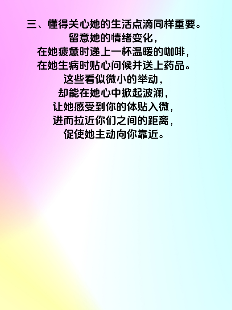一、女生都渴望被真诚对待。当你在与她相处时,眼神专注,认真倾听她的每一句话,不敷衍、不打断,她能真切感受到你的尊重与在乎。比如,她分享工作中的趣事,你微笑着耐心听完,适时给予回应,这会让她觉得你是特别的存在,从而更愿意靠近你。 二、展现自身独特魅力也很关键。拥有自己的兴趣爱好,专注投入其中时会散发出别样光彩。若你热爱运动,在球场上挥洒汗水的模样,会吸引她的目光;若你擅长绘画,专注创作的神态,会让她心生欣赏。这种由内而外散发的魅力,会像磁石一样吸引女生自动靠近。 三、懂得关心她的生活点滴同样重要。留意她的情绪变化,在她疲惫时递上一杯温暖的咖啡,在她生病时贴心问候并送上药品。这些看似微小的举动,却能在她心中掀起波澜,让她感受到你的体贴入微,进而拉近你们之间的距离,促使她主动向你靠近。