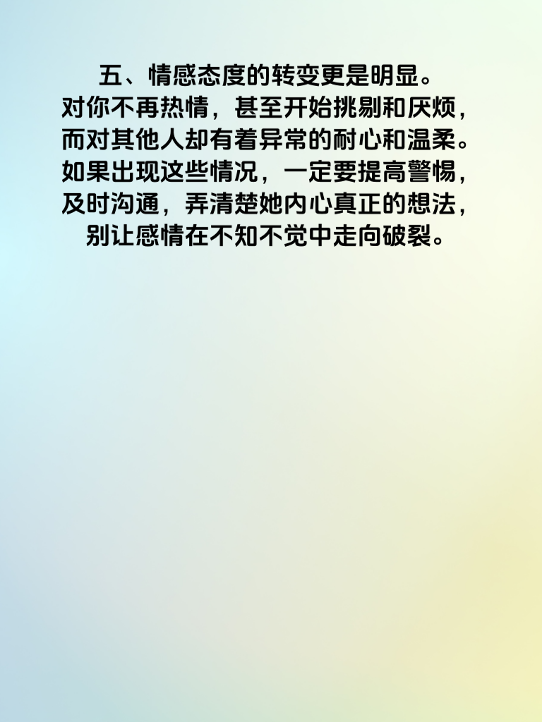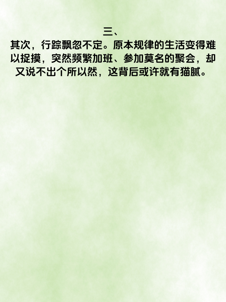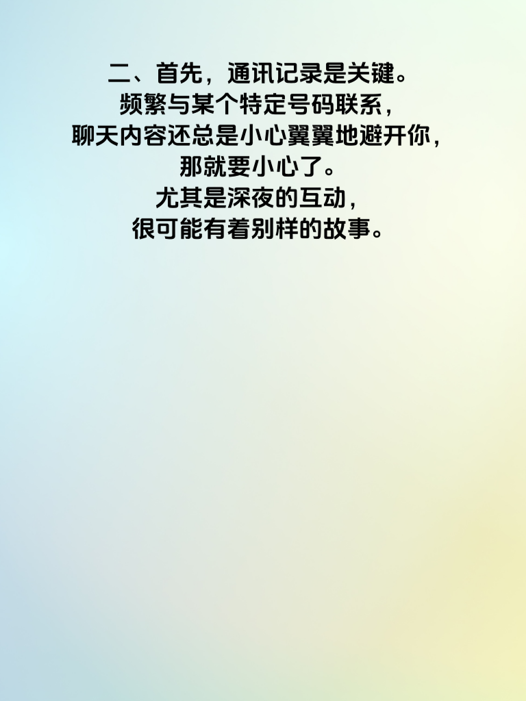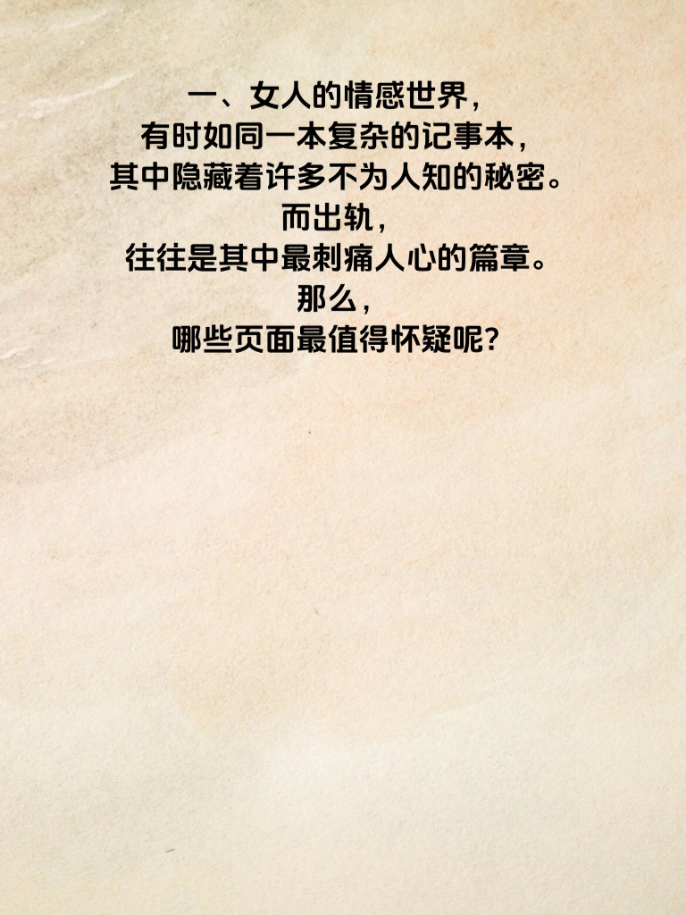 一、女人的情感世界,有时如同一本复杂的记事本,其中隐藏着许多不为人知的秘密。而出轨,往往是其中最刺痛人心的篇章。那么,哪些页面最值得怀疑呢? 二、首先,通讯记录是关键。频繁与某个特定号码联系,聊天内容还总是小心翼翼地避开你,那就要小心了。尤其是深夜的互动,很可能有着别样的故事。 三、其次,行踪飘忽不定。原本规律的生活变得难以捉摸,突然频繁加班、参加莫名的聚会,却又说不出个所以然,这背后或许就有猫腻。 四、再者,个人物品也会露出马脚。比如突然多了一些不属于她风格的小物件,或者衣物上有陌生的气味,这些看似细微的变化,都可能暗示着她的出轨迹象。 五、情感态度的转变更是明显。对你不再热情,甚至开始挑剔和厌烦,而对其他人却有着异常的耐心和温柔。如果出现这些情况,一定要提高警惕,及时沟通,弄清楚她内心真正的想法,别让感情在不知不觉中走向破裂。
